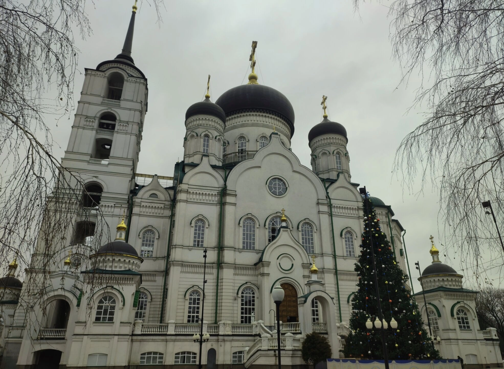 Белоснежный храм, увенчанный пятью тёмными куполами с сияющими золотыми крестами, символизирует Христа и четырёх евангелистов. Рядом возвышается многоярусная колокольня, являющаяся неотъемлемой частью архитектурного ансамбля. На переднем плане фотографии видны ветви деревьев, а справа от собора установлена нарядная новогодняя ель, что указывает на зимний период съёмки.