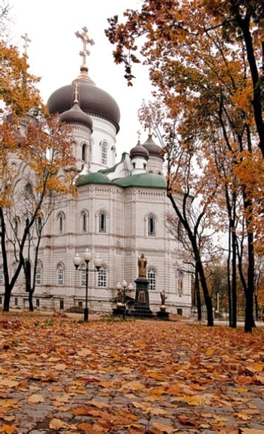 На представленной фотографии запечатлён величественный Благовещенский кафедральный собор, являющийся главным православным храмом Воронежской митрополии. Снимок сделан в прекрасный осенний день, о чём свидетельствуют золотистые листья, устилающие землю, и деревья в ярком осеннем уборе, что придает изображению особую поэтичность и торжественность.