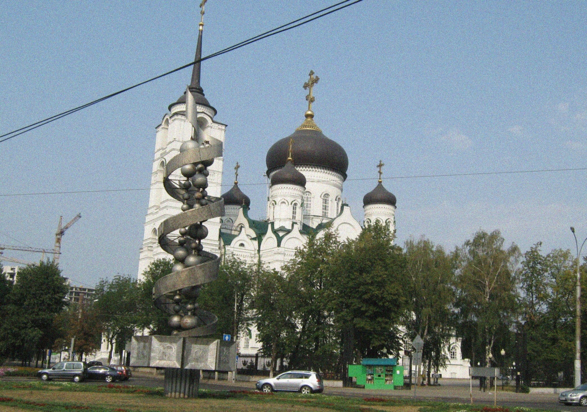 На переднем плане фотографии расположена стела «Слава советской науке», создающая уникальный исторический и культурный контраст. Этот монумент, установленный в середине XX века, представляет собой спиралевидную конструкцию, украшенную символами научного прогресса: микроскопом, орбитами электронов и химическими ретортами. Подобное соседство символизирует сложный путь России, где вера и наука, прошлое и настоящее существуют в неразрывном единстве.