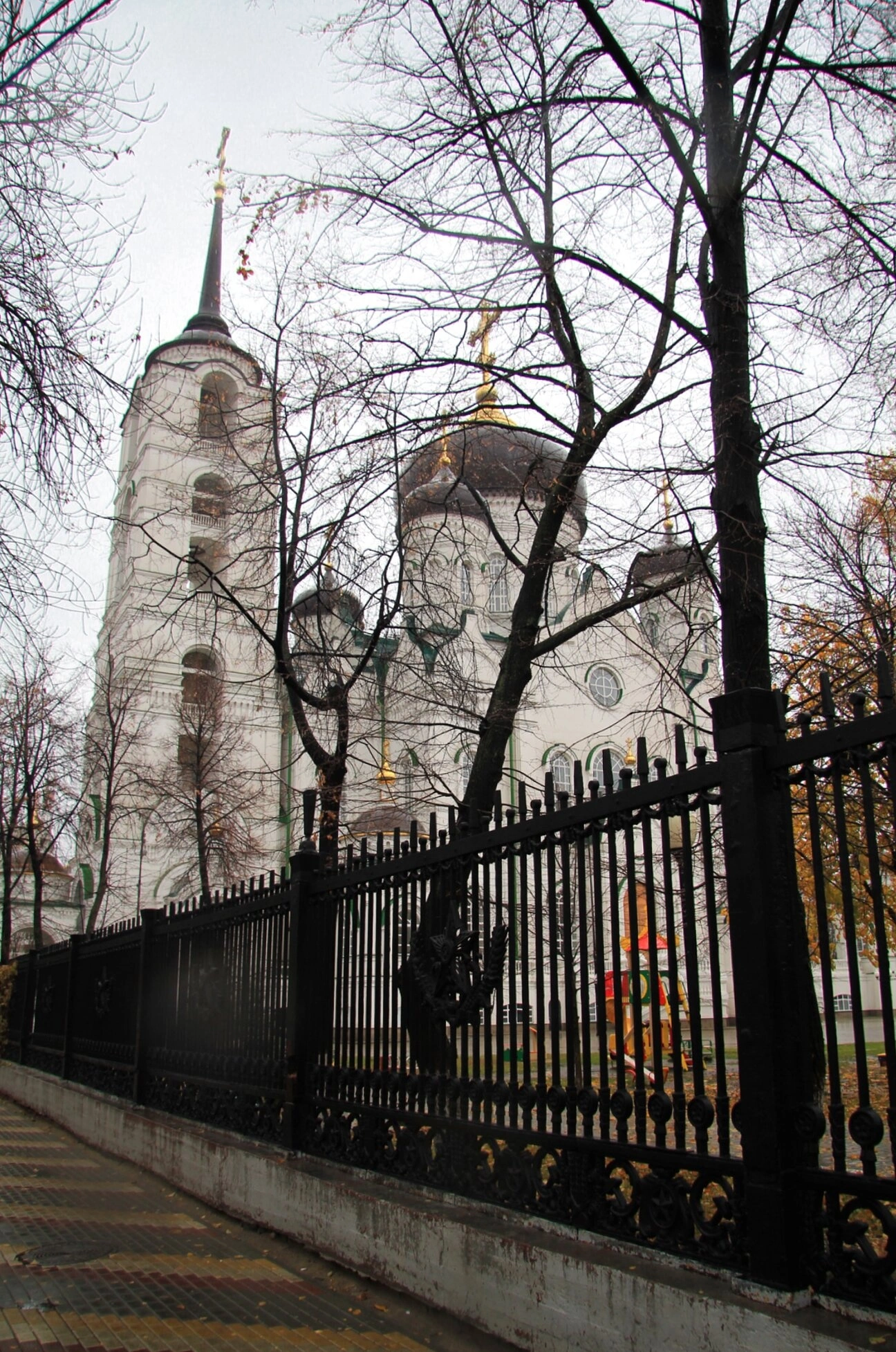 Территория вокруг собора благоустроена и ограждена ажурным кованым забором чёрного цвета, который гармонично сочетается со светлым фасадом храма. На переднем плане виднеется историческая брусчатка, добавляющая снимку особый колорит. Деревья без листвы позволяют предположить, что фотография сделана в межсезонье — ранней весной или поздней осенью.