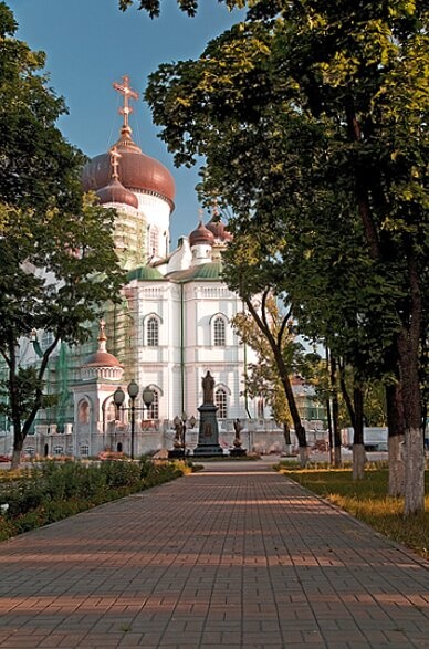Мягкое естественное освещение, характерное для утренних или предвечерних часов, наполняет снимок спокойствием и умиротворением. Длинные лёгкие тени ложатся на дорожку, а пышная зелень деревьев с густой листвой образует естественный зелёный коридор, обрамляющий путь к храму. Общая атмосфера фотографии передаёт величие православной веры, мирную торжественность и незыблемость духовных основ, воплощённых в камне. Благовещенский собор в Воронеже по праву считается одной из жемчужин русского церковного зодчества и центром духовной жизни всего Черноземья.