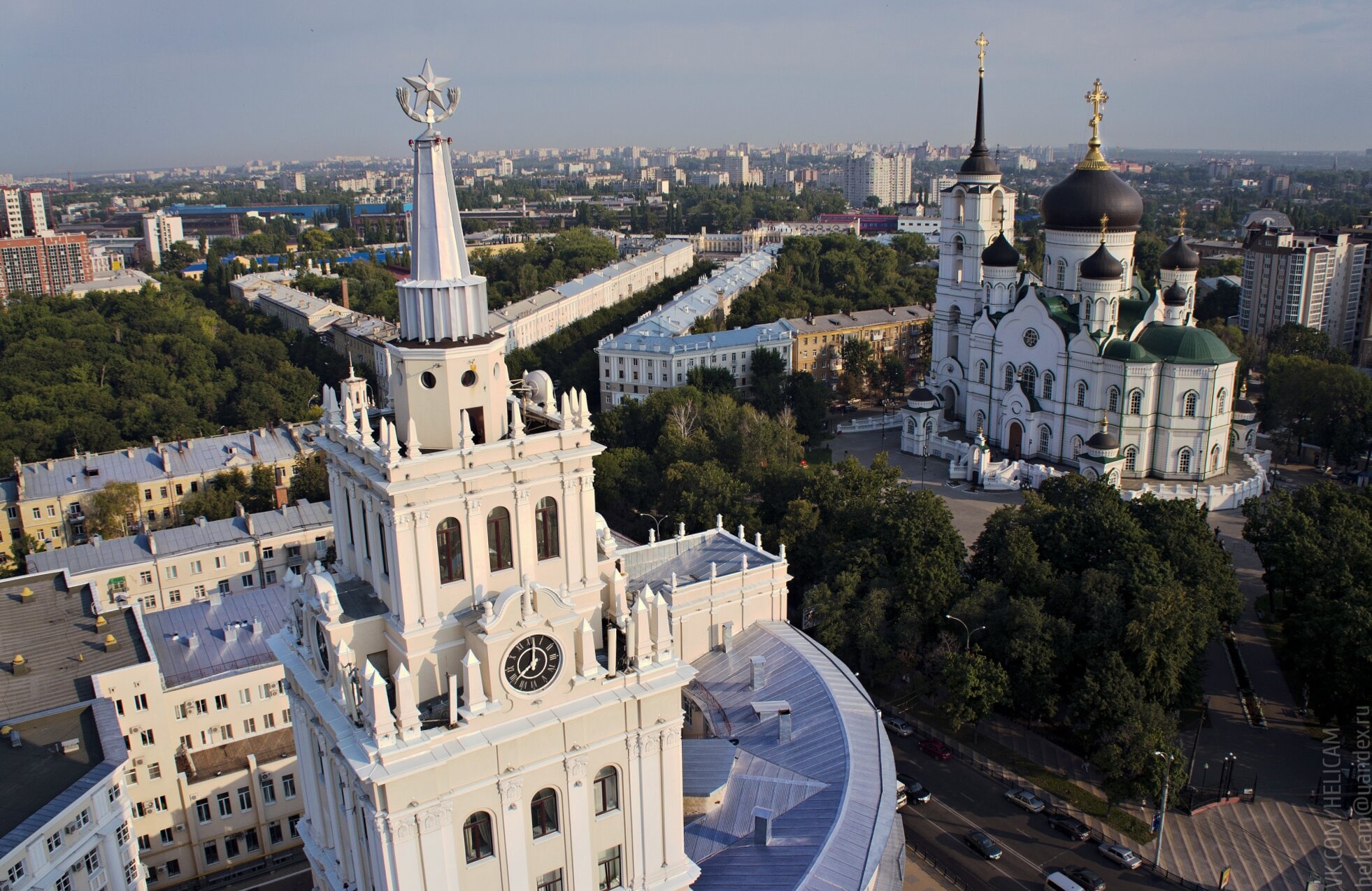На представленной фотографии запечатлён величественный Благовещенский кафедральный собор города Воронежа, снятый с высоты птичьего полёта. Этот собор является одним из самых крупных православных храмов России и главным кафедральным собором Воронежской митрополии. Его золотые купола, сияющие на солнце, и монументальный белокаменный облик создают неповторимый архитектурный образ, доминирующий в панораме города.