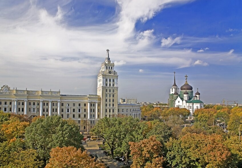На представленной фотографии запечатлен величественный Благовещенский кафедральный собор, расположенный в историческом центре Воронежа. Этот православный храм, возведенный в 1998-2009 годах, является третьим по величине в России и одним из самых высоких православных храмов мира, достигая высоты 97 метров.