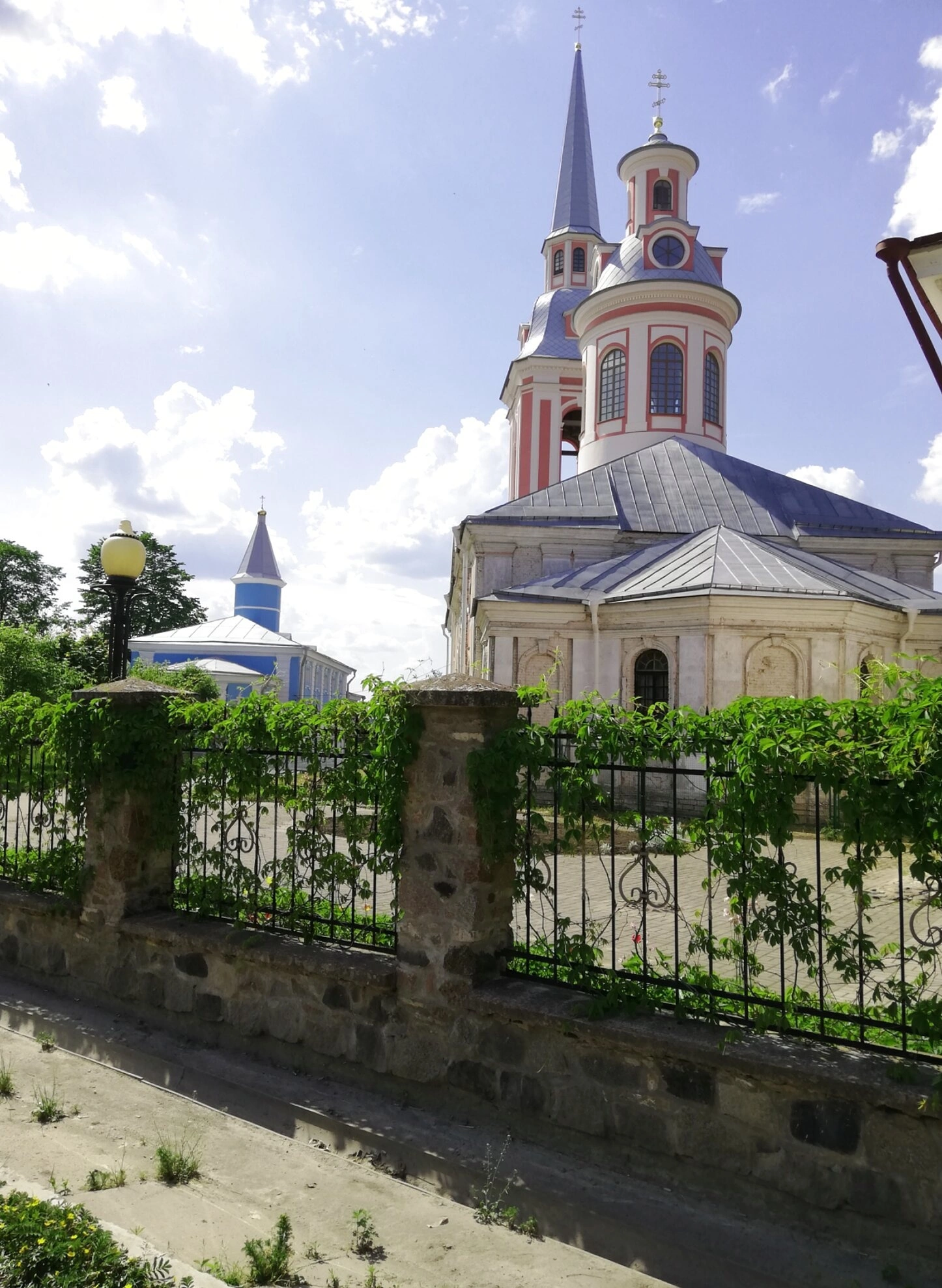 Благовещенский собор, доминирующий на снимке, был возведён в 1764 году на месте обветшавшей деревянной церкви. Храм представляет собой величественное двухэтажное сооружение, увенчанное мощным пятиглавием. Его архитектура характерна для русского барокко елизаветинской эпохи, отличаясь торжественностью форм и богатством декоративного убранства. Верхний храм был освящён в честь Благовещения Пресвятой Богородицы, а нижний — во имя Святых Первоверховных Апостолов Петра и Павла.