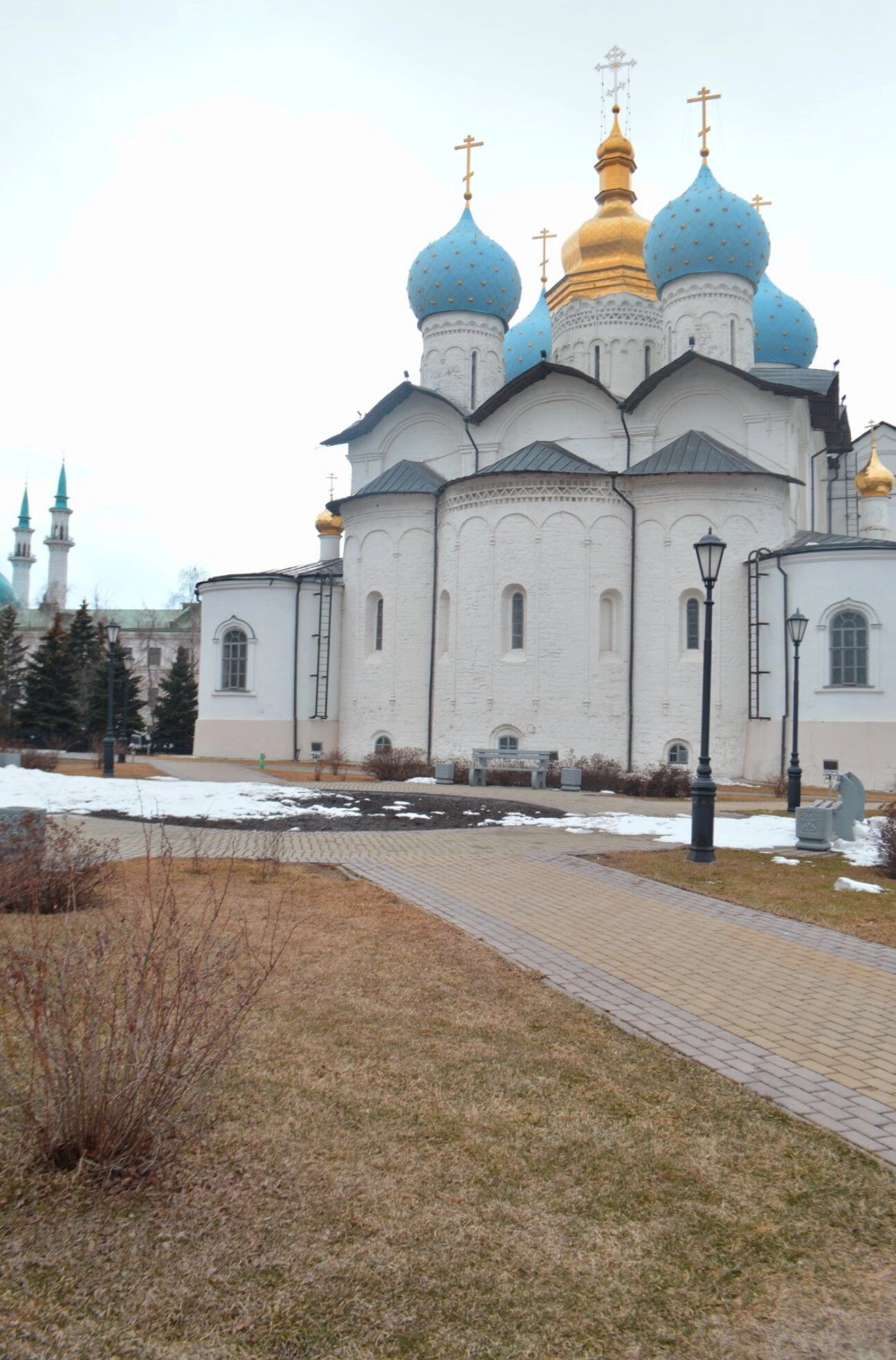 На фотографии отчетливо видно, что собор расположен в межсезонье — вероятно, ранней весной или поздней осенью, о чем свидетельствуют участки с сухой травой и голыми кустарниками вокруг храма. Рядом с собором проходит мощеная дорожка, а на заднем плане виден минарет, что подчеркивает уникальное соседство православных и мусульманских святынь на территории Казанского кремля.