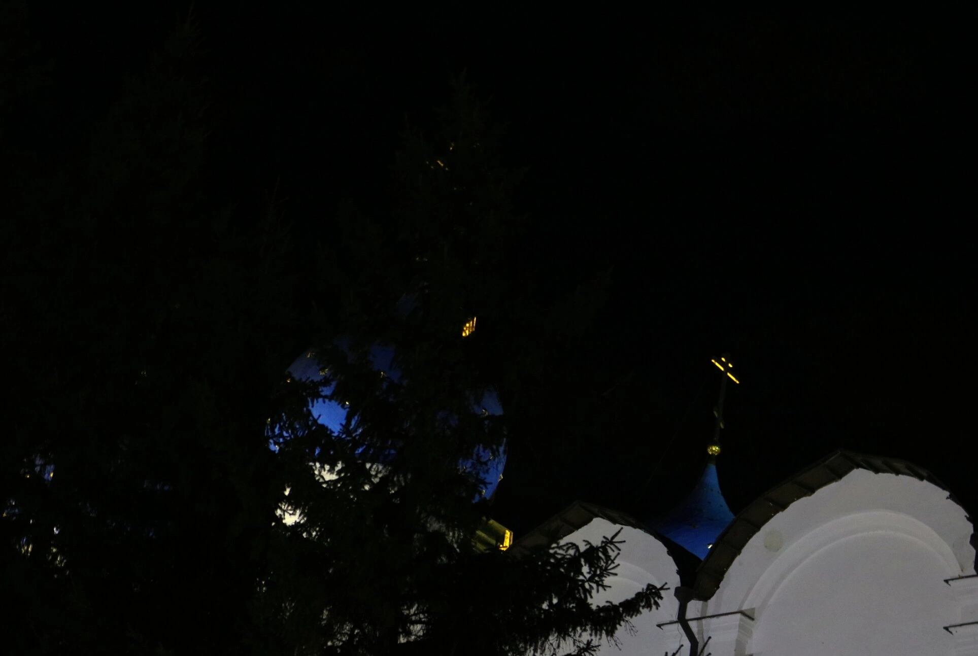 Композицию кадра дополняют окружающие собор деревья, чьи темные силуэты обрамляют храм и создают эффект глубины пространства. Ветви хвойных деревьев частично закрывают фасад здания, добавляя снимку естественности и гармонии с природным окружением. Благовещенский собор, являющийся важнейшим памятником православной архитектуры Казани, предстает на этом ночном снимке во всем своем величии и духовной красоте.