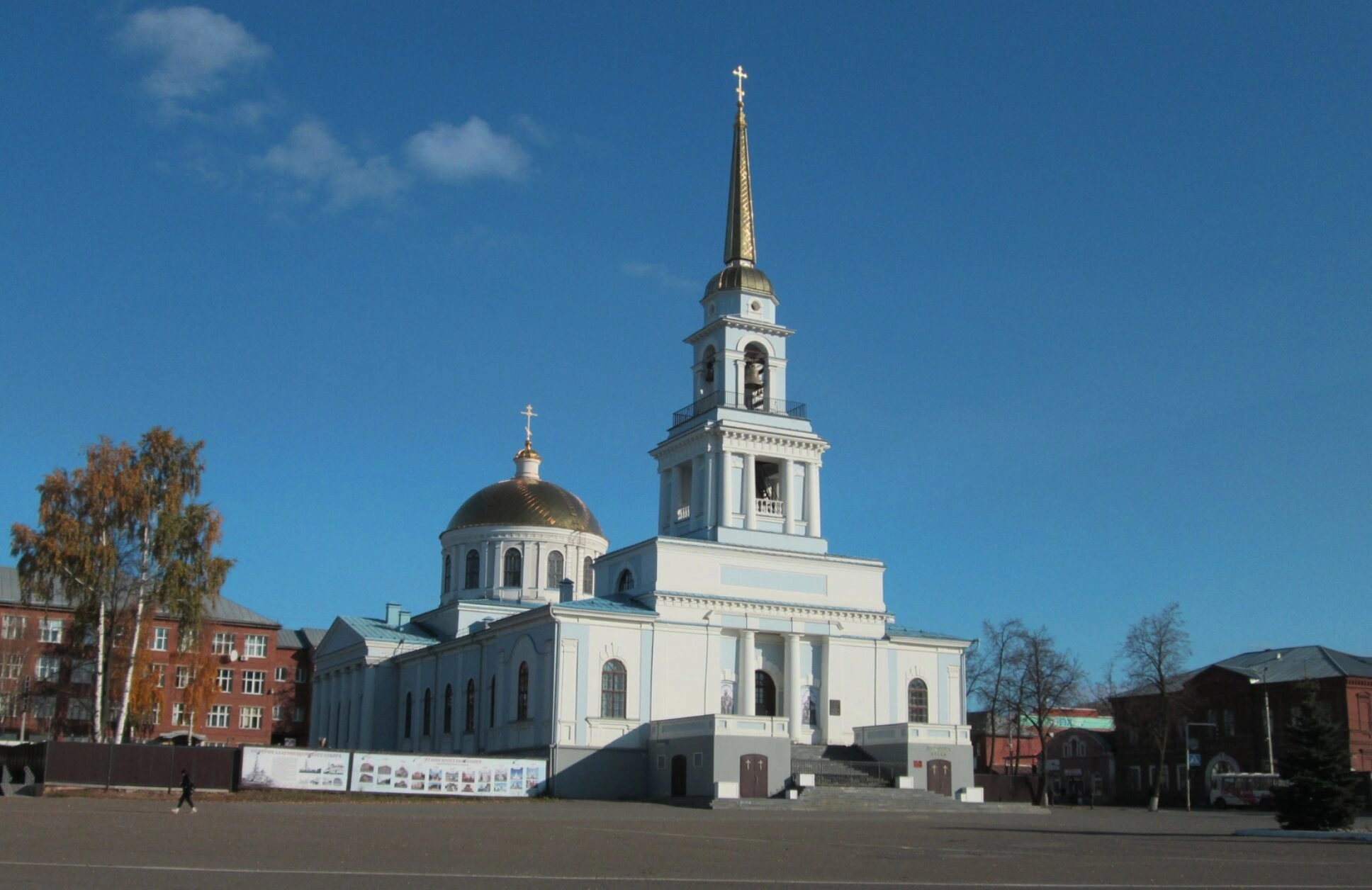 На представленной фотографии запечатлён величественный Благовещенский собор, расположенный в городе Воткинске Удмуртской Республики. Этот православный храм является значимым духовным центром и архитектурной доминантой города.