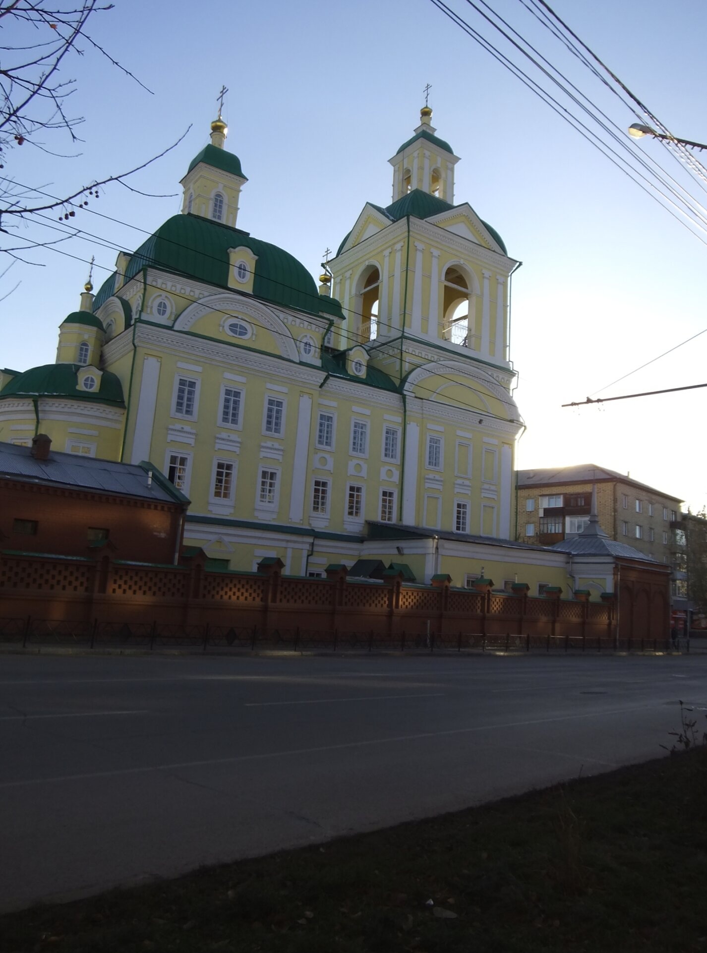 Передний план фотографии занимает проезжая часть и фрагмент кирпичной ограды, отделяющей святую обитель от мирской суеты. На заднем плане справа от собора просматриваются современные городские постройки, что создаёт интересное противопоставление между древней святыней и окружающим её градским пространством, символизируя неразрывную связь истории и современности.