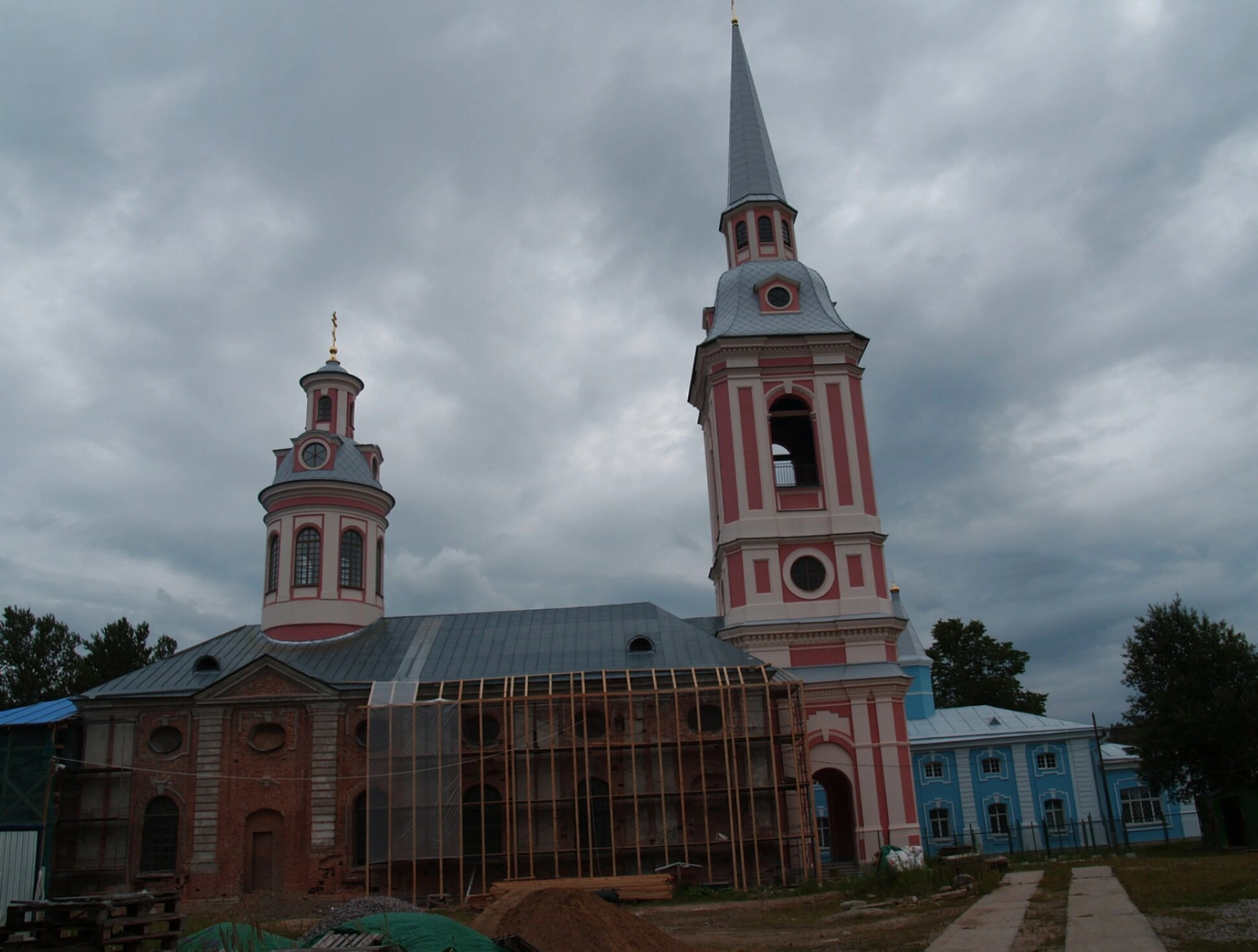На представленной фотографии запечатлён величественный Благовещенский собор, расположенный в историческом центре города Шлиссельбурга на Красной площади. Этот православный храм, освящённый в честь Благовещения Пресвятой Богородицы, является выдающимся памятником церковной архитектуры XVIII века и важнейшей духовной святыней города.