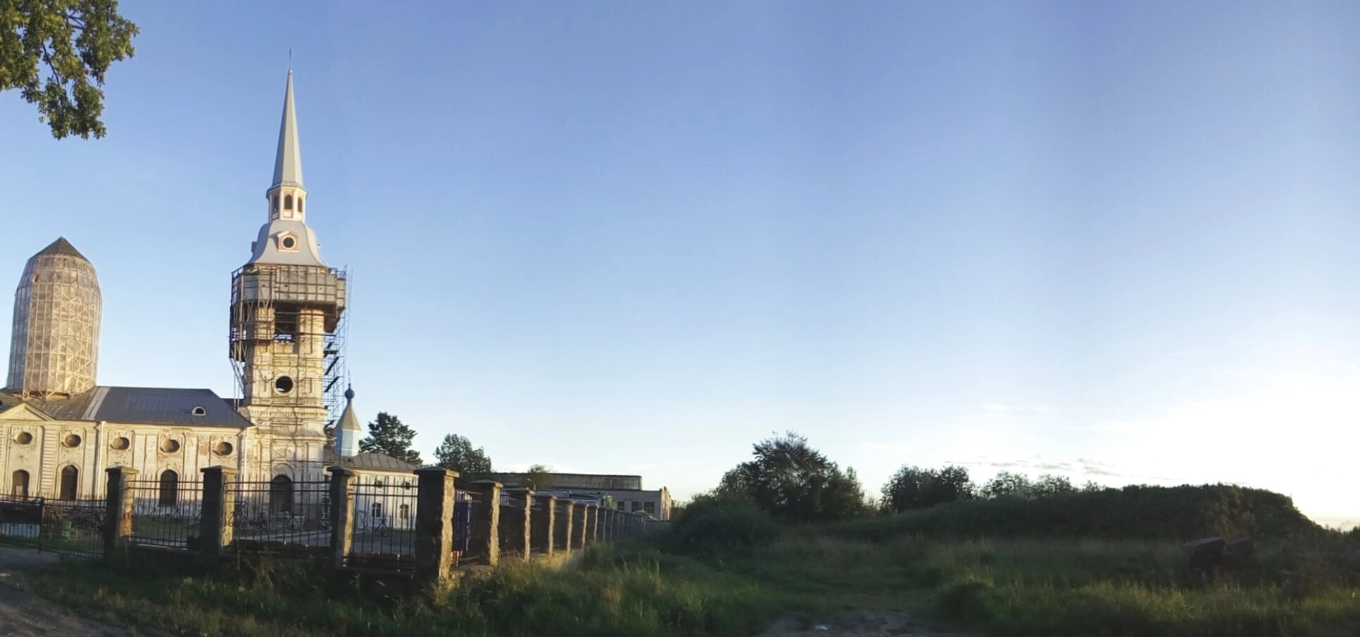 На представленной фотографии запечатлён Благовещенский собор, расположенный в древнем городе Шлиссельбурге Ленинградской области. Величественный храм, освящённый в честь Благовещения Пресвятой Богородицы, является значимым памятником русской церковной архитектуры и духовным центром. На снимке собор запечатлён в период проведения реставрационных работ, о чём красноречиво свидетельствуют установленные строительные леса вокруг центрального барабана и шпиля.