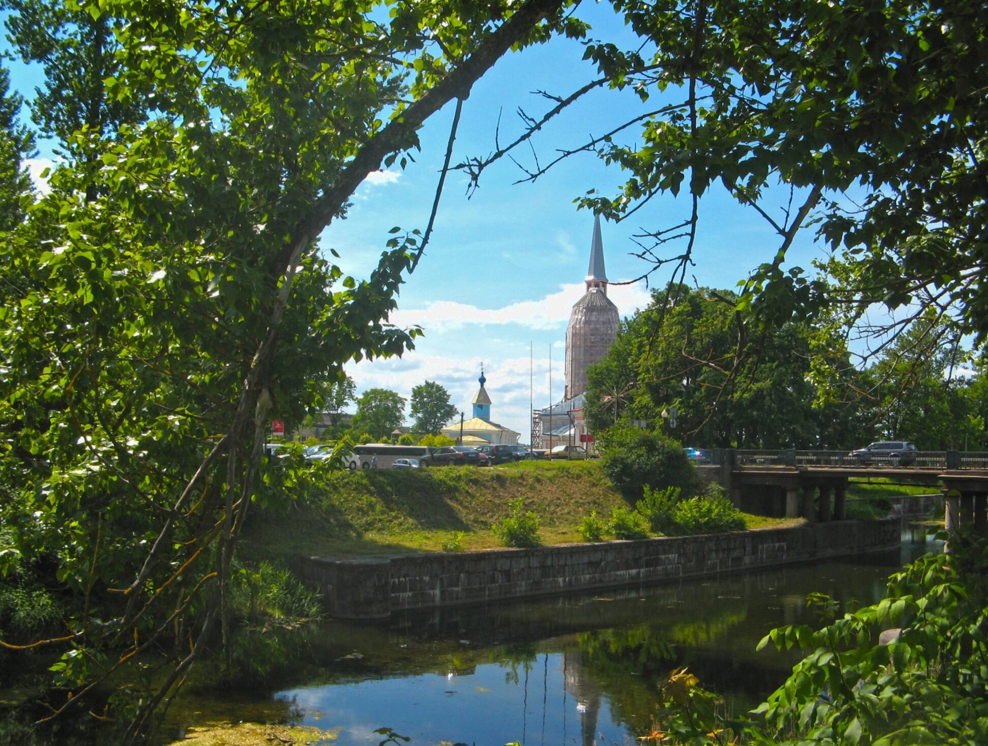 На представленной фотографии запечатлён величественный вид на старинный город Шлиссельбург, что в Ленинградской области. Центральным элементом композиции является колокольня Благовещенского собора — духовной доминанты и одной из главных православных святынь города. Стройный шатровый шпиль колокольни, устремлённый в небеса, символизирует молитвенное предстояние перед Господом.