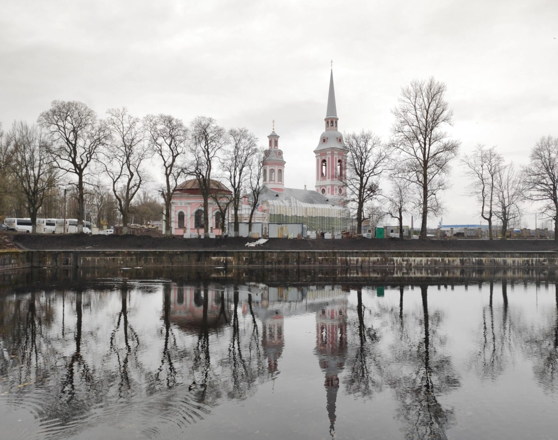 На снимке собор красуется в своём величии, отражаясь в спокойных водах канала. Пасмурное осеннее небо с облачным покровом создаёт мягкое, рассеянное освещение, подчёркивая монументальность архитектурных форм и гармоничность пропорций храма. Оголённые ветви деревьев, окружающих собор, указывают на позднюю осень или раннюю весну, добавляя снимку особое лирическое настроение и ощущение тихого благоговения.