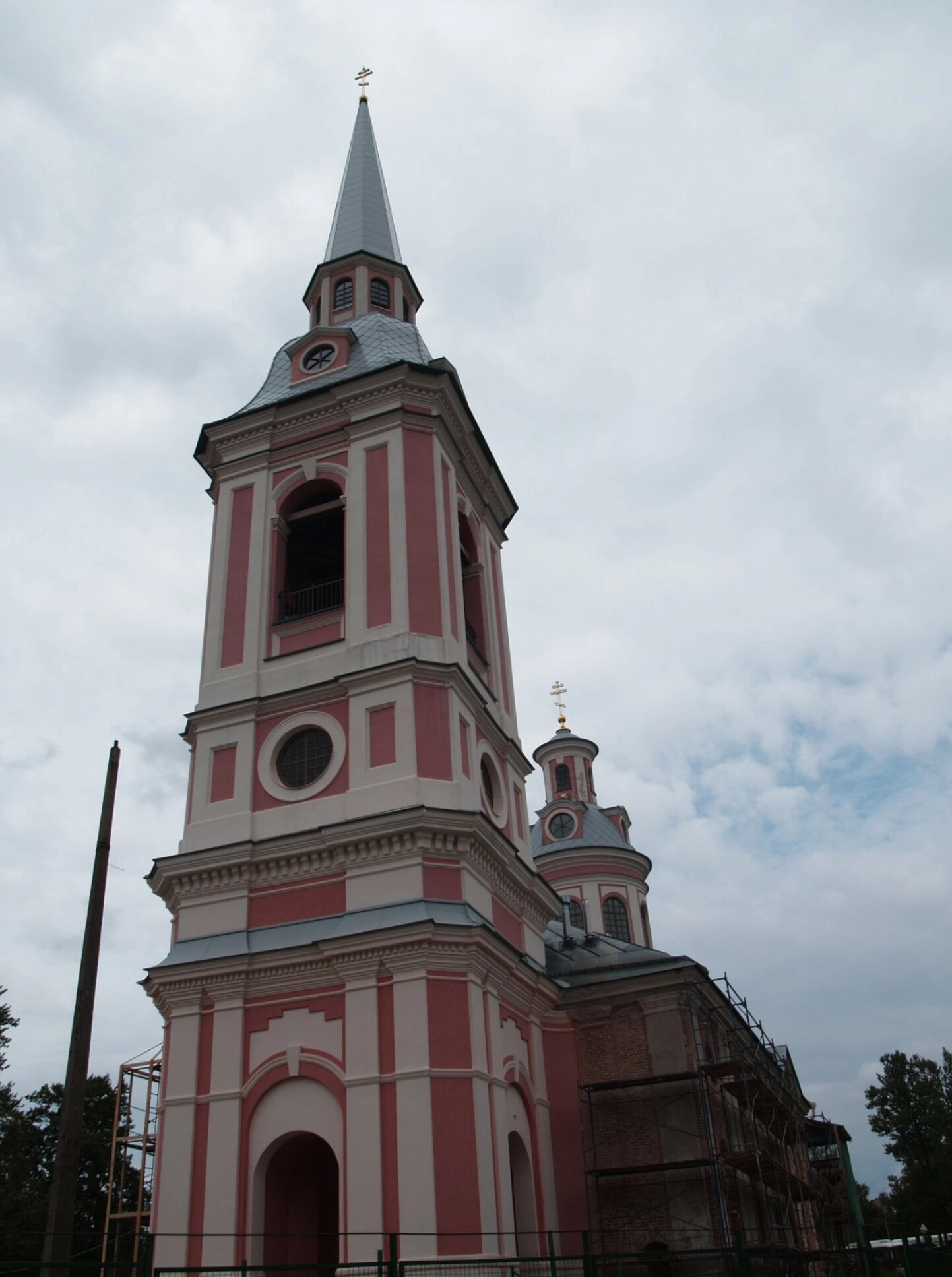 На представленной фотографии запечатлён величественный Благовещенский собор, являющийся главным православным храмом древнего города Шлиссельбург. Снимок выполнен с нижнего ракурса, что позволяет в полной мере оценить монументальность и духовную мощь этого архитектурного сооружения, устремлённого в небесную высь.