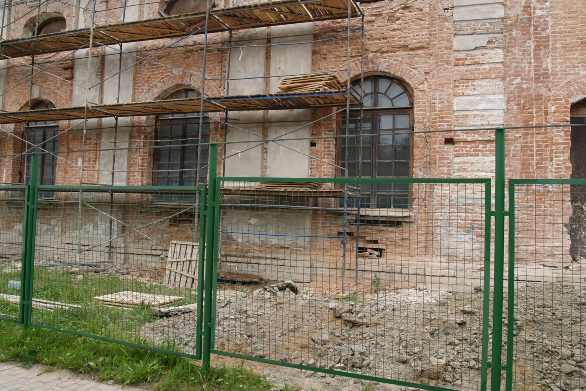 На представленной фотографии запечатлён Благовещенский собор, расположенный в древнем городе Шлиссельбурге Ленинградской области. Это величественное кирпичное здание, являющееся объектом культурного наследия, находится на важном этапе своей истории – проведении реставрационных работ. Фасад храма частично скрыт за строительными лесами, что свидетельствует о непрекращающейся работе по сохранению этого духовного и архитектурного памятника.