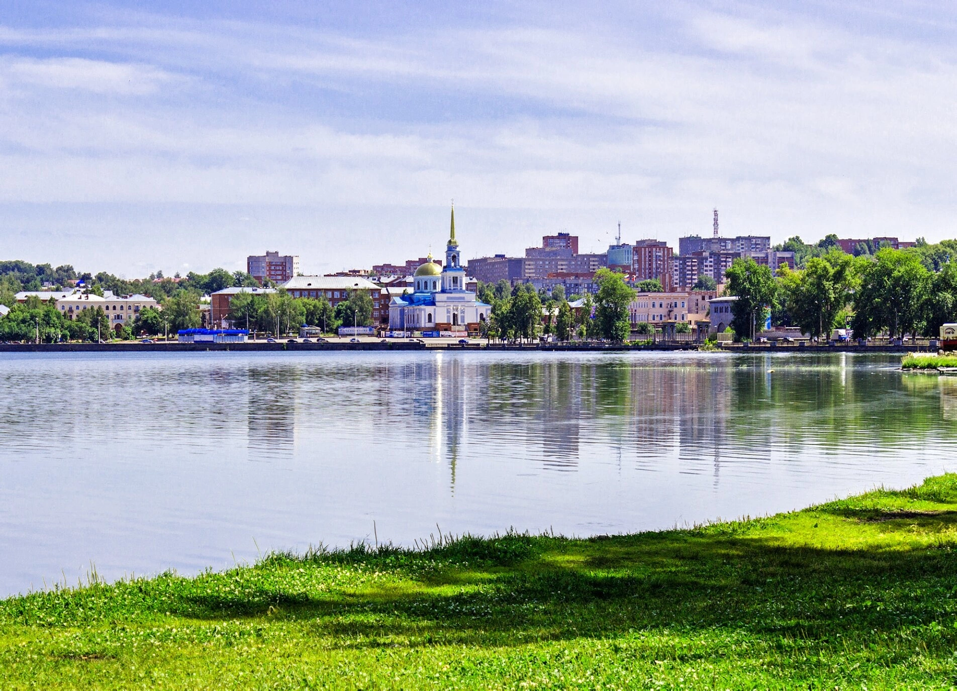 На снимке собор гармонично отражается в спокойных водах обширного Воткинского пруда, создавая вместе с небесной сенью и городским пейзажем на заднем плане умиротворённую и прекрасную картину. Этот образ символизирует неразрывную связь небесного и земного, духовной твердыни и мирской жизни. Прибрежная зелень на переднем плане подчёркивает единство творения Божия, а панорама города напоминает о том, что храм является центром притяжения для всего города.
