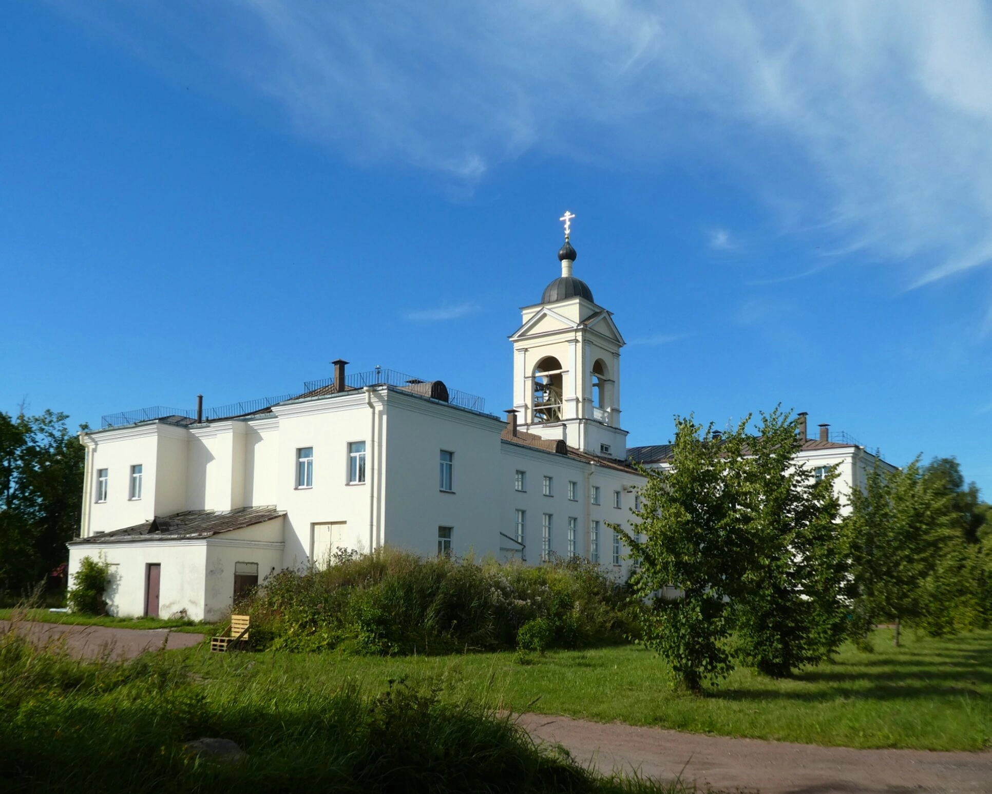На представленной фотографии запечатлён исторический архитектурный комплекс, расположенный в посёлке Сергиево (ранее известном как Володарское) within Ленинградской области. Ансамбль включает в себя здание богадельни и примыкающую к ней домовую церковь, освящённую во имя преподобного Андрея Критского.