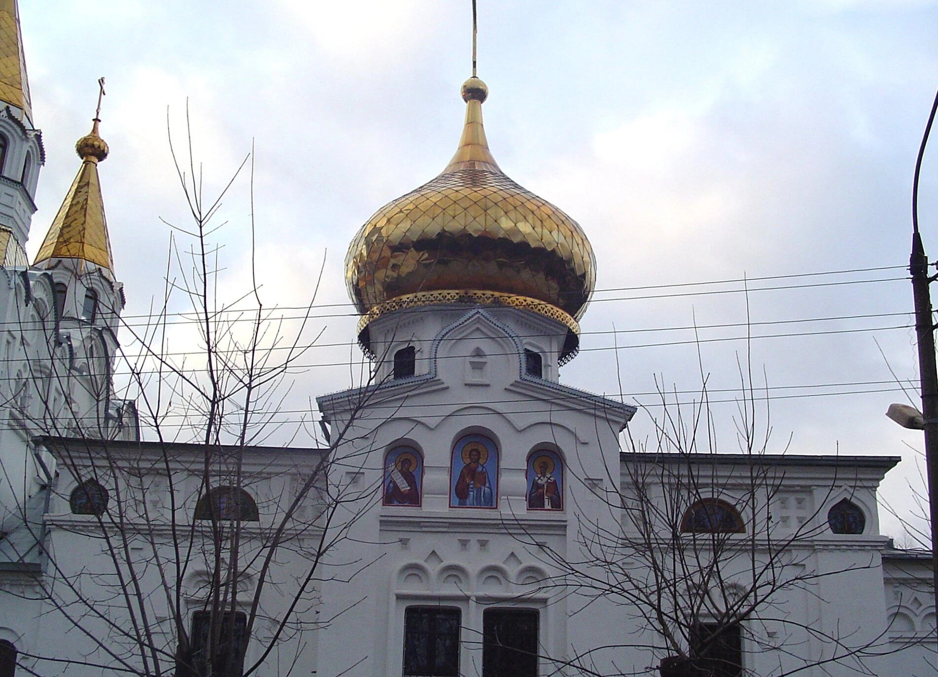 На переднем плане фотографии видны голые ветви деревьев, что указывает на осенний или ранневесенний период. Справа от церковного здания проходит линия электропередач с фонарным столбом, свидетельствующая о расположении храма в городской черте. Слева просматривается часть ещё одного церковного строения с золотым куполом, что говорит о наличии архитектурного ансамбля.
