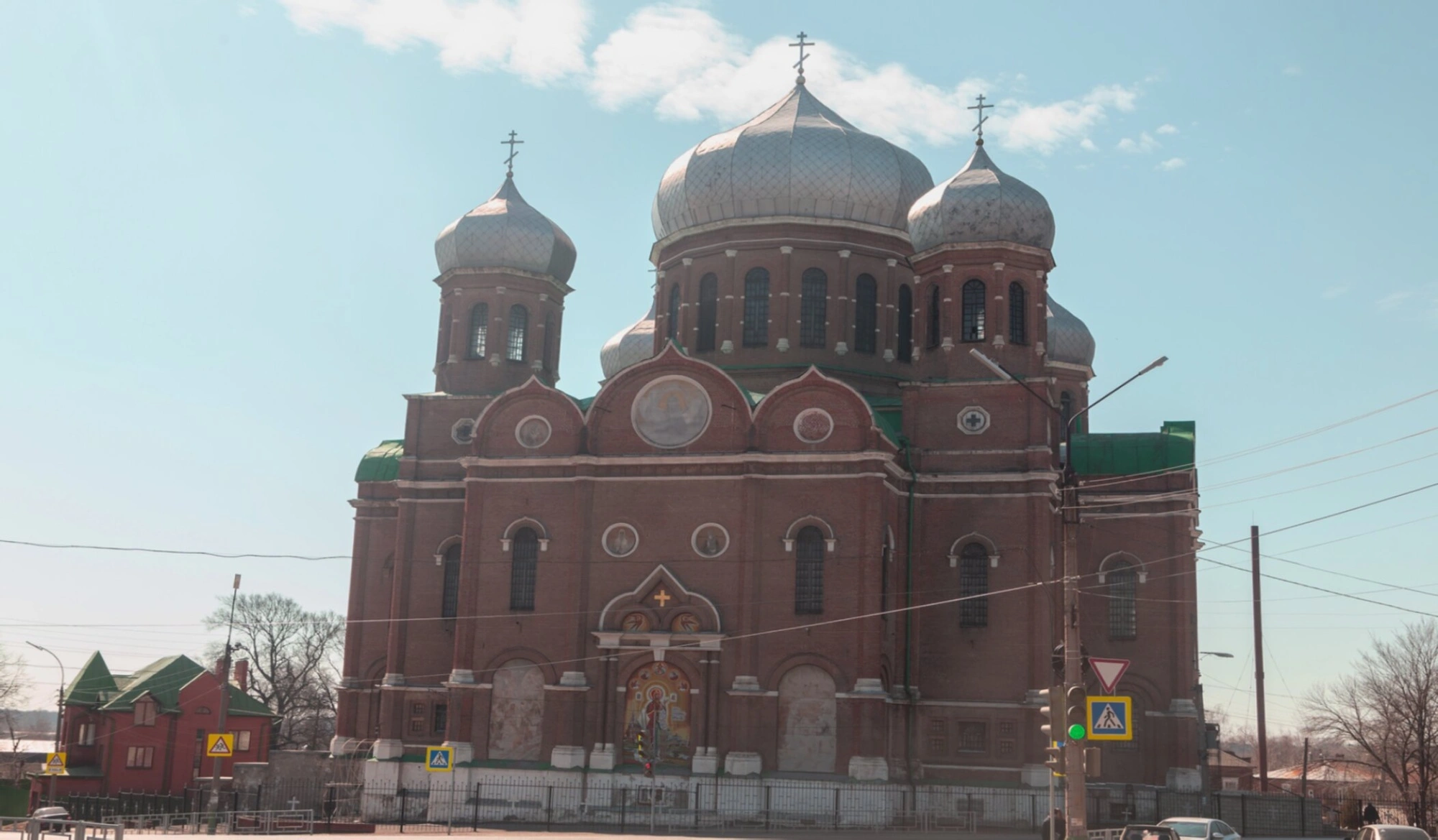 На представленной фотографии запечатлён величественный Боголюбский кафедральный собор, находящийся в городе Мичуринске Тамбовской области. Это пятикупольный храм, являющийся выдающимся памятником церковной архитектуры второй половины XIX века и важнейшей духовной святыней региона.