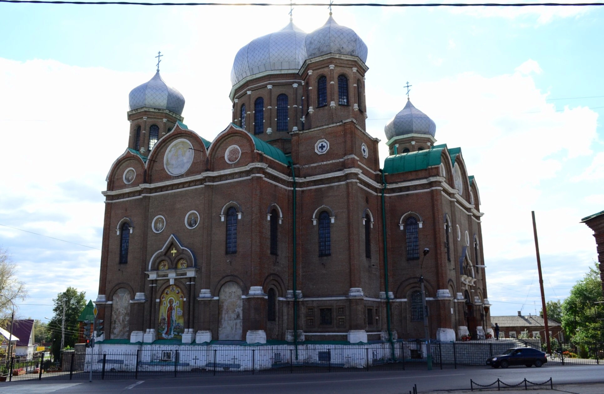 Визуальное содержание снимка передаёт монументальность и благолепие собора. Здание выстроено из красного кирпича и увенчано несколькими главами, покрытыми металлическим листом серебристого оттенка, которые венчают православные кресты. Фасад храма богато украшен декоративными элементами и арочными оконными проёмами, характерными для русского стиля. У центрального входа можно различить святые образы.