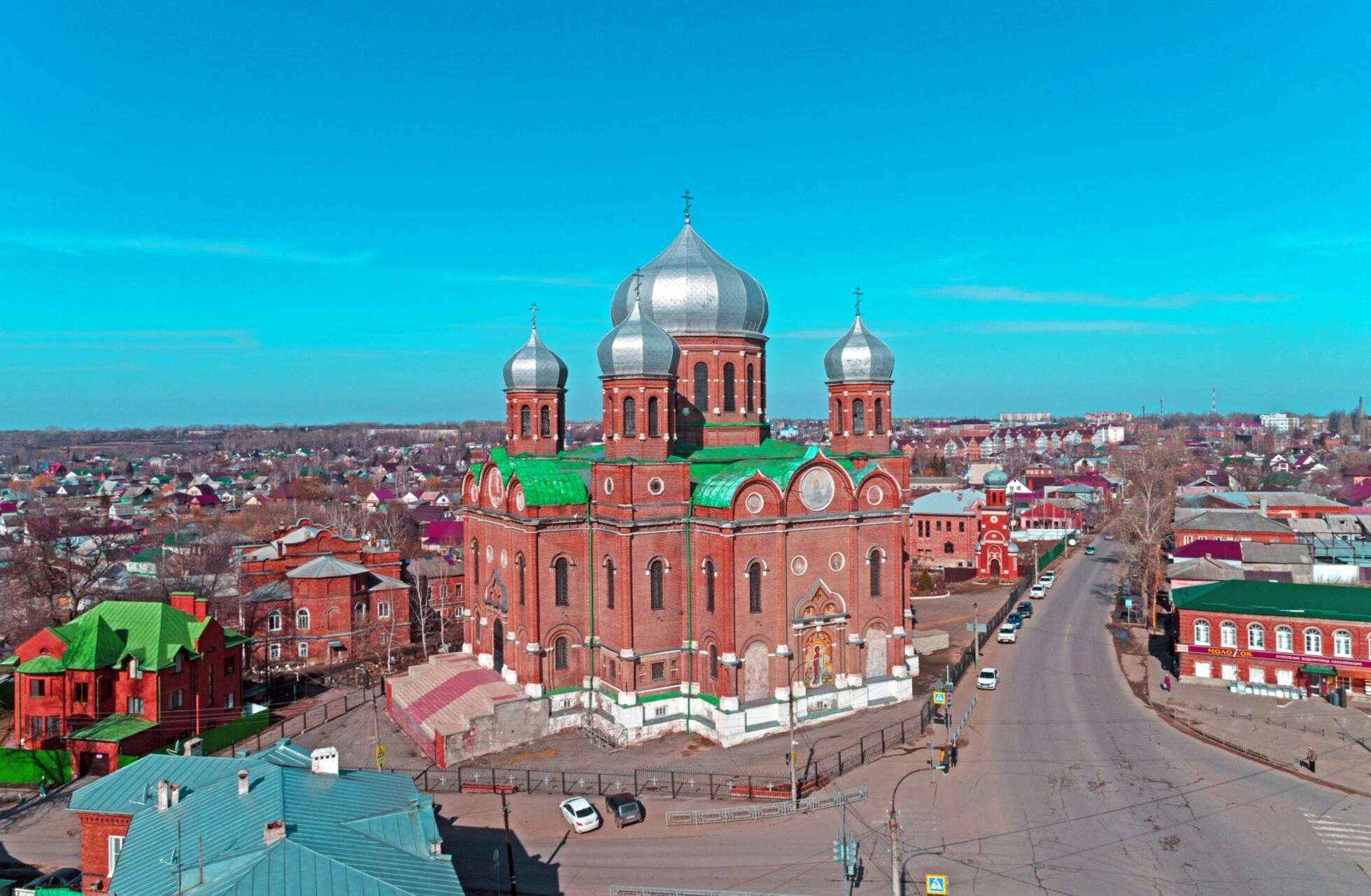 На представленной фотографии запечатлён Боголюбский кафедральный собор, являющийся одной из architectural доминант и главной святыней города Мичуринска Тамбовской области. Снимок выполнен с высоты птичьего полёта в ясный солнечный день, что позволяет в полной мере оценить монументальность храма и его гармоничное единство с окружающим городским пространством.