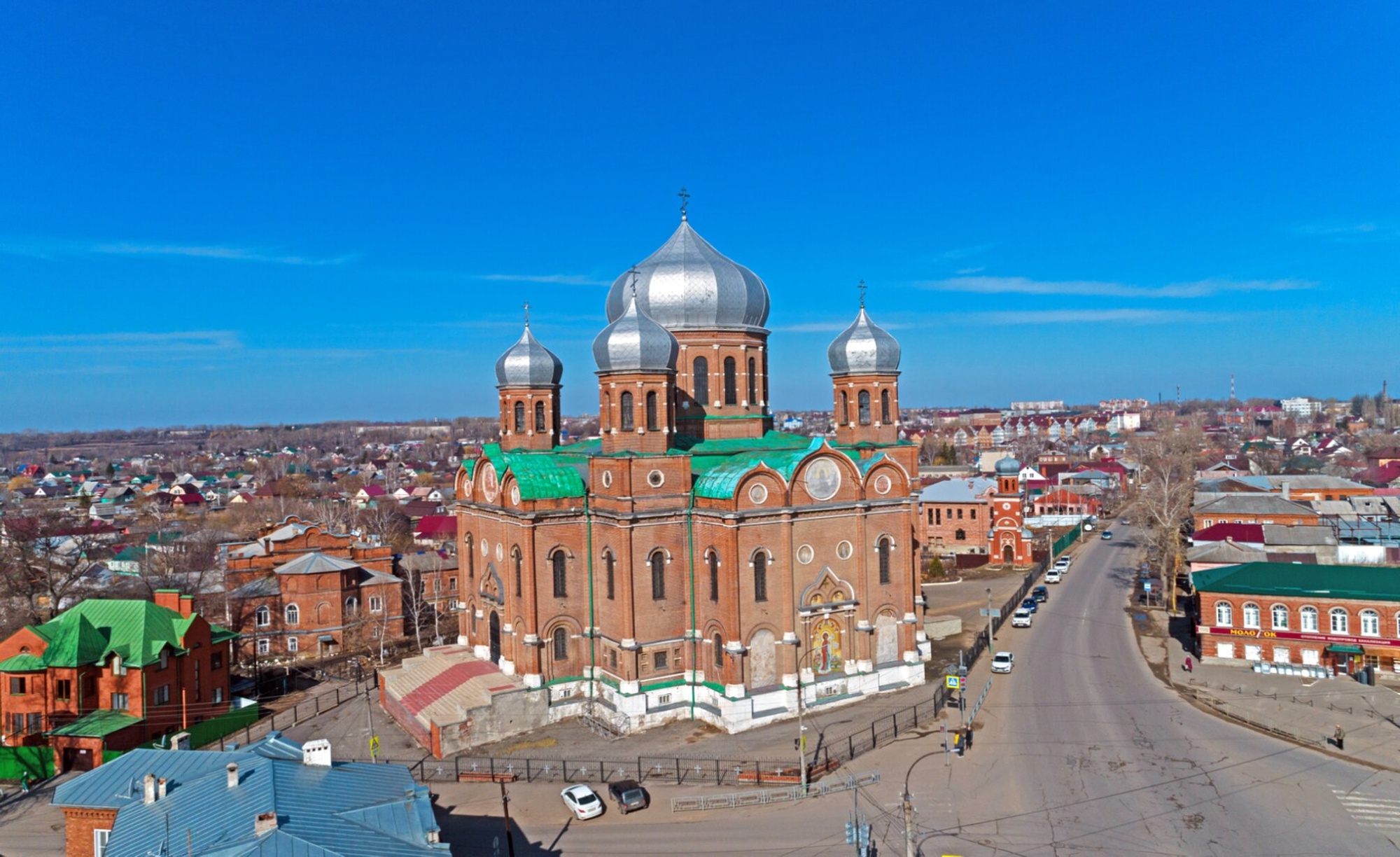 На представленной фотографии запечатлён величественный Боголюбский собор, расположенный в городе Мичуринске Тамбовской области. Храм освящён в честь чудотворной Боголюбской иконы Божией Матери, одной из самых почитаемых святынь на Руси. Собор является выдающимся памятником церковной архитектуры второй половины XIX века и неотъемлемой частью духовной жизни города.