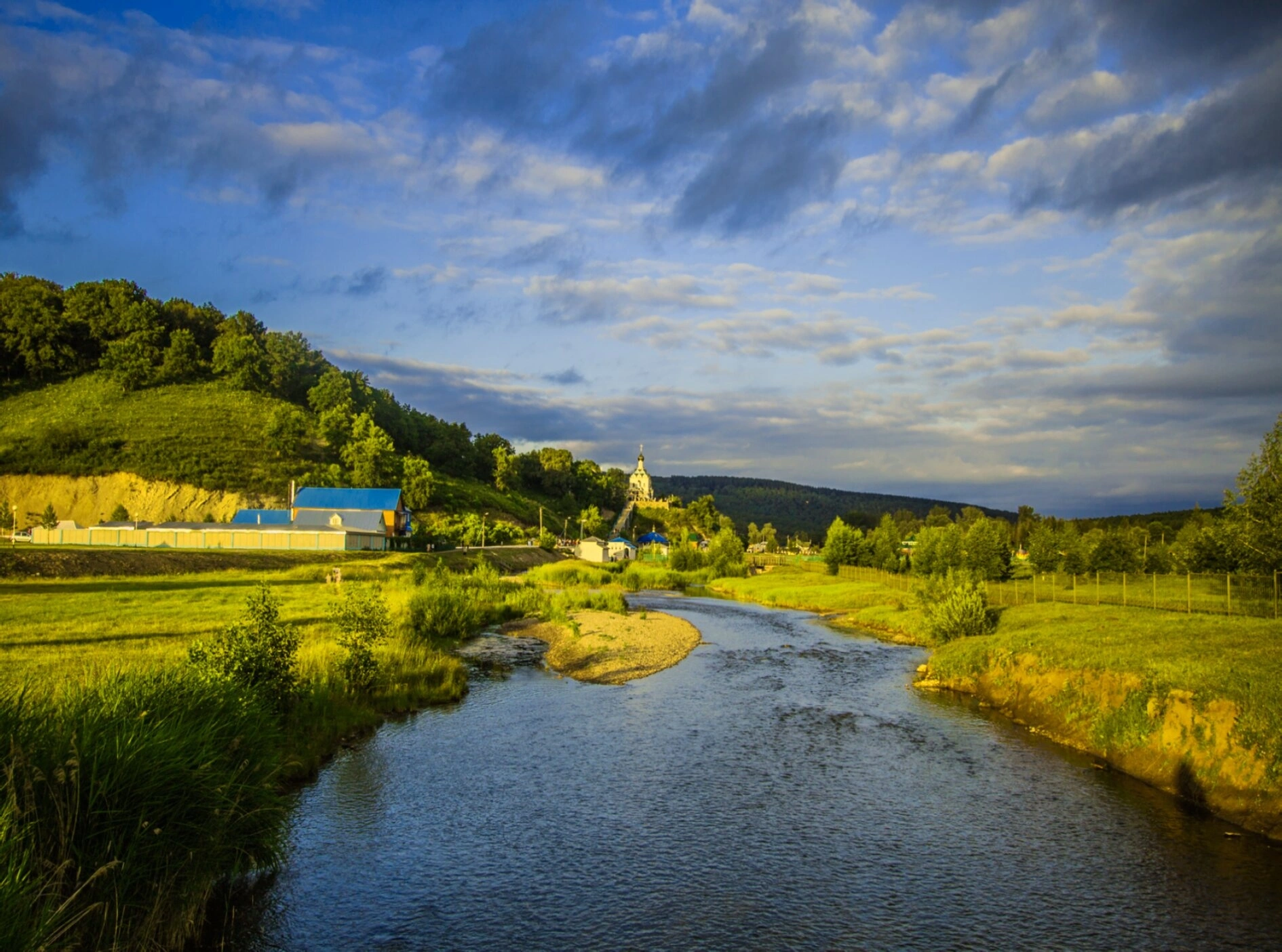 На представленной фотографии запечатлён живописный сельский пейзаж, в котором гармонично сочетается природная красота и православная святыня. В центре композиции, на вершине пологого холма, возвышается белый храм с колокольней и куполом — это Богородице-Табынский женский монастырь. Обитель расположена в селе Курорта Гафурийского района Республики Башкортостан.