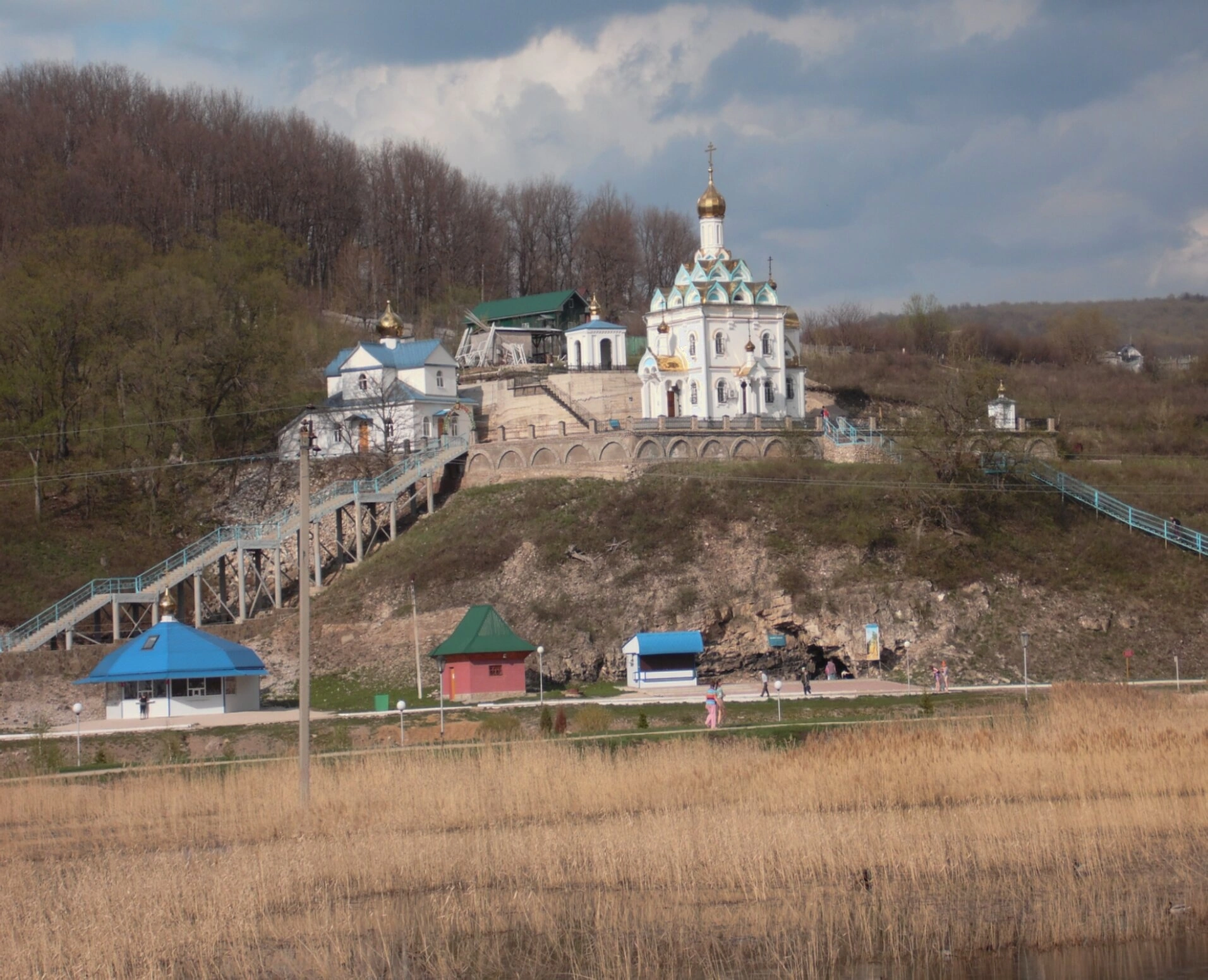 Центральное место на снимке занимает главный храм обители, сияющий златоглавыми куполами, которые устремлены в небесную высь. К его святым вратам ведёт монументальная лестница, поднимающаяся по склону холма, — путь, символизирующий восхождение души к горнему миру. У подножия холма расположились скромные монастырские постройки, где совершаются ежедневные труды и молитвы насельниц. На переднем плане фотографии виден водоём, питаемый святыми источниками, с зарослями прибрежной растительности, придающими месту особый умиротворённый вид.