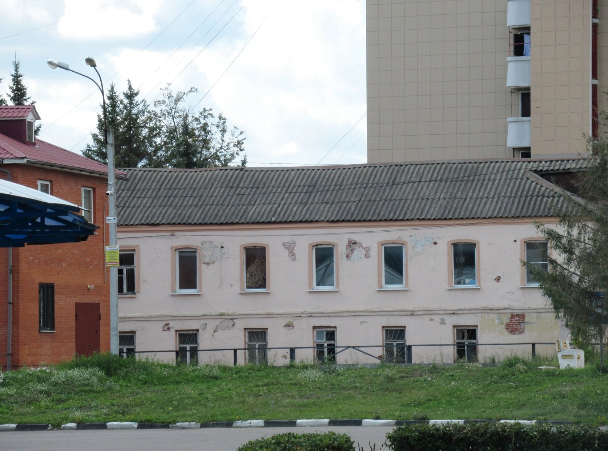 Кровля храма покрыта серым шифером, что характерно для многих провинциальных церквей России. Перед храмом виден ухоженный газон с зелёной травой и бордюр. С левой стороны фотографии просматривается часть соседнего здания с красной крышей. Архитектурный ансамбль храма контрастирует с современным многоэтажным зданием, виднеющимся на заднем плане, что символично отражает связь времён и поколений.
