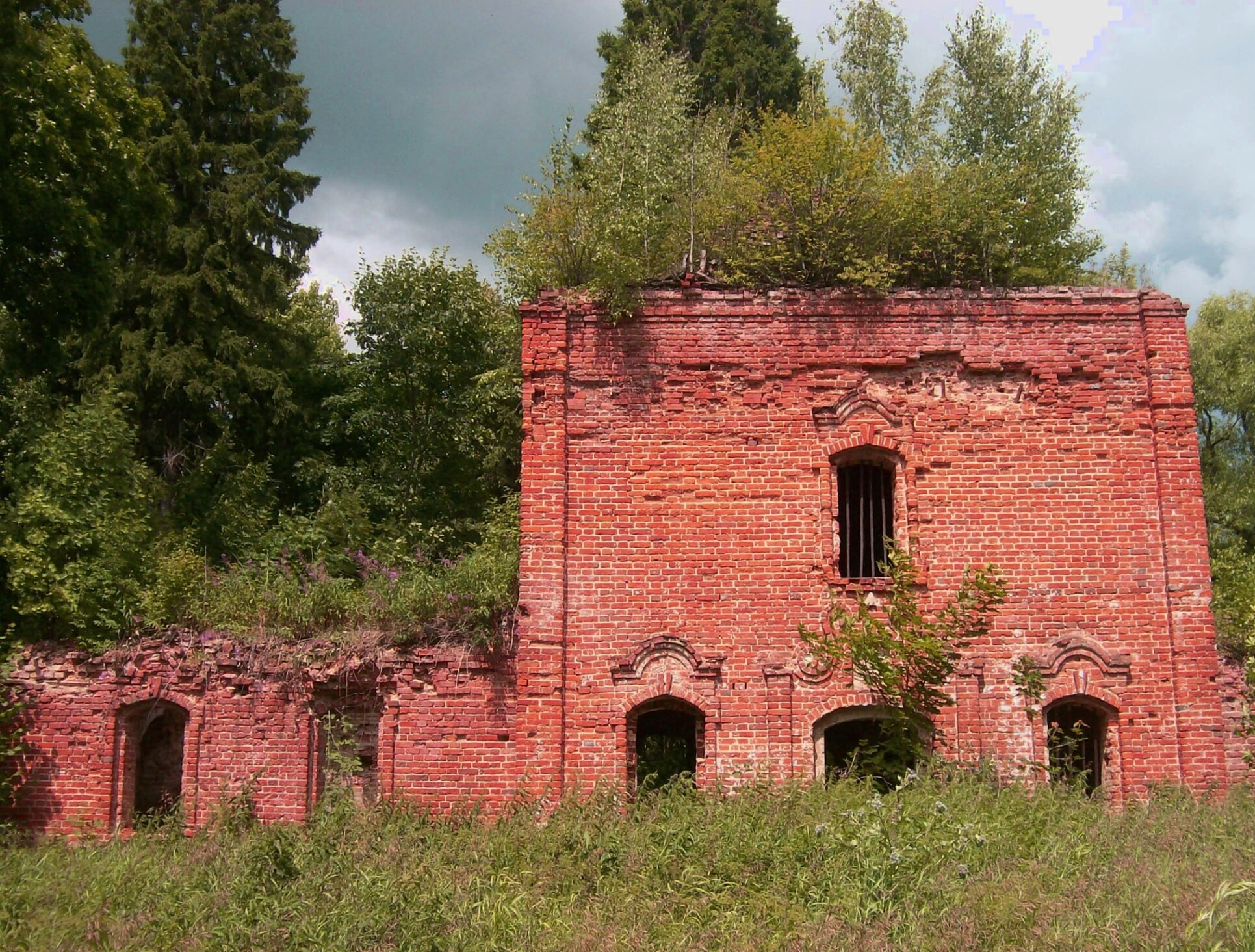 Богоявленская церковь была построена в XIX веке и представляет собой характерный образец храмовой архитектуры этого периода. Здание выполнено из красного кирпича, с традиционными для православных церквей архитектурными элементами. На фотографии хорошо просматривается основной объем храма, хотя частично он скрыт разросшейся растительностью.