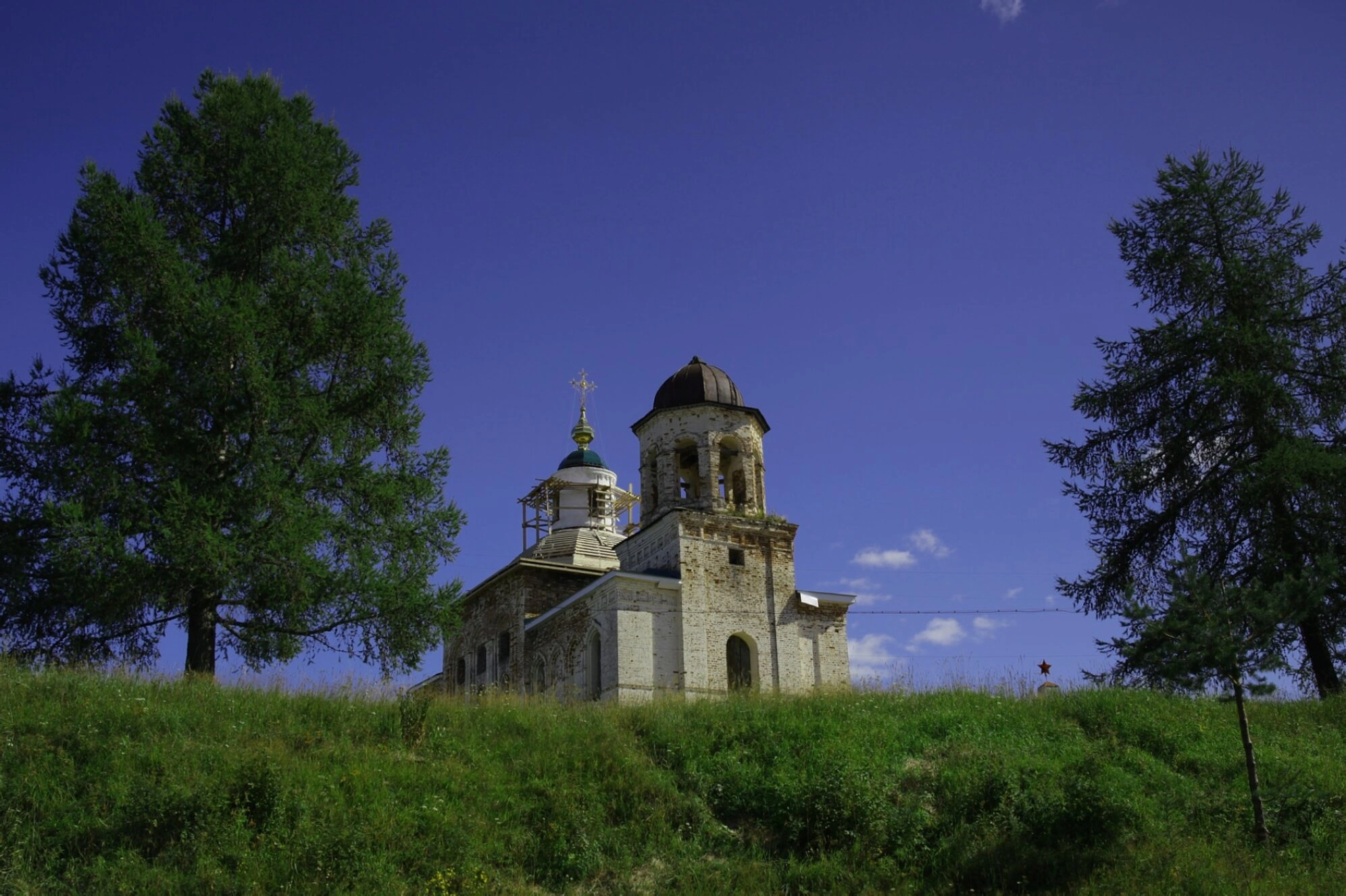 На фотографии запечатлён Богоявленский храм, расположенный в деревне Ляли Княжпогостского района Республики Коми. Этот православный храм, освящённый в честь Богоявления Господня, является значимым памятником церковной архитектуры середины XIX века и объектом культурного наследия регионального значения. Здание было построено в период с 1852 по 1856 год на месте ранее существовавшей деревянной церкви, уничтоженной пожаром в конце XVIII века. Храм располагается на живописном высоком берегу реки Вымь, доминируя над окружающей застройкой и формируя уникальный исторический ландшафт села.