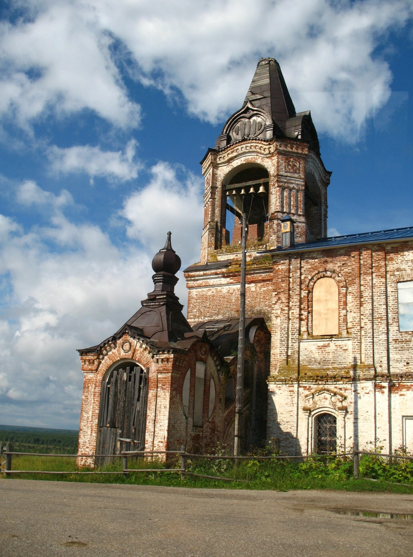 На представленной фотографии запечатлен Богоявленский храм, расположенный в селе Ляли (Онежье) Княжпогостского района Республики Коми. Этот православный храм, ныне пребывающий в полуразрушенном состоянии, представляет собой значительный памятник церковной архитектуры начала XX века.