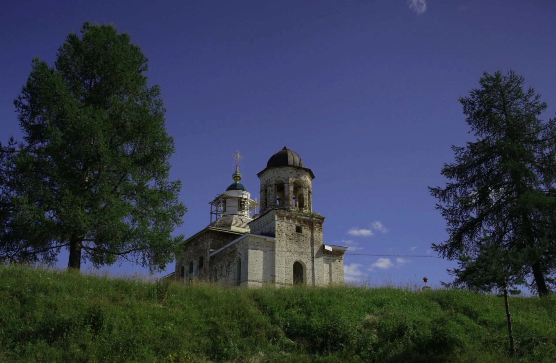 Святыня расположена на живописном возвышении, что подчеркивает ее духовное значение в окружающем ландшафте. По сторонам храма возвышаются вековые хвойные деревья - ели и сосны, которые создают естественное обрамление для церковного строения и символизируют вечность и неизменность православной веры.