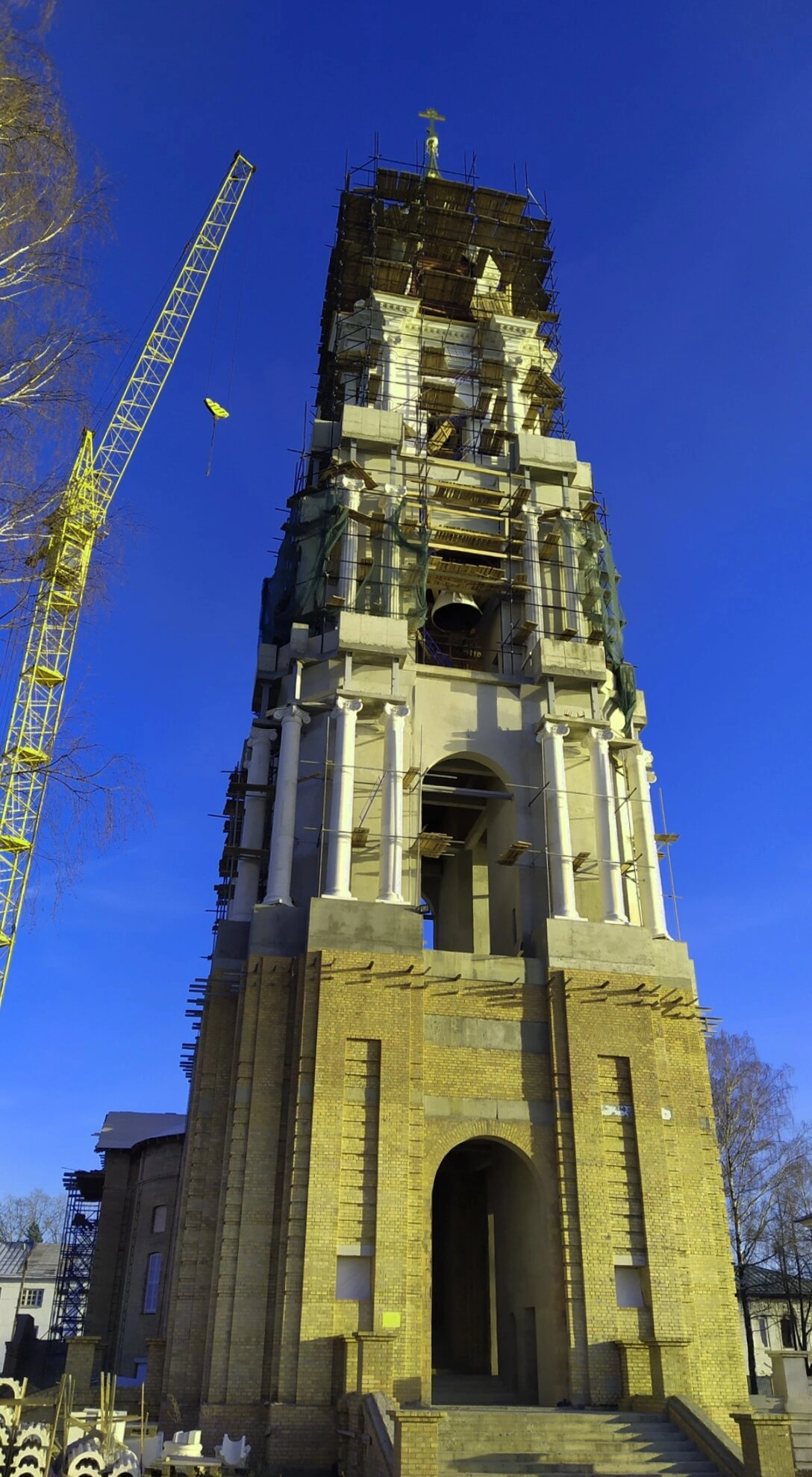 На представленном снимке запечатлён исторический момент возведения или масштабного восстановления Богоявленского собора, являющегося центральным храмом древнего Костромского кремля. На изображении явственно видны строительные леса, окутавшие своды и стены здания, а также подъёмный кран, что свидетельствует об активной фазе работ. Чистое голубое небо над стройплощадкой придаёт сей картине величие и благодатный покой.