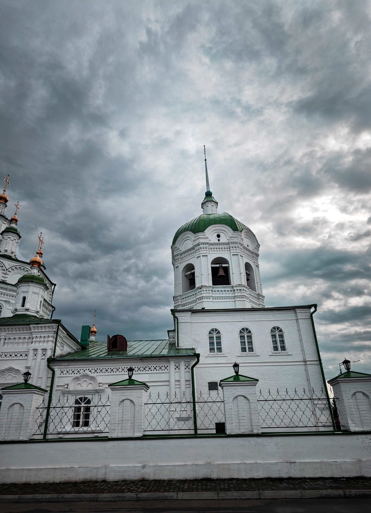 Собор представляет собой прекрасный образец сибирского барокко, для которого характерно сочетание монументальности форм с изящным и богатым декором. Белоснежные стены храма, увенчанные зелёными куполами, создают яркий контраст с пасмурным небом на заднем плане, подчёркивая духовную устремлённость сооружения ввысь. На фотографии хорошо просматривается высокая колокольня со шпилем, арочные оконные проёмы и intricate детали фасадного убранства, включая резные наличники и карнизы.