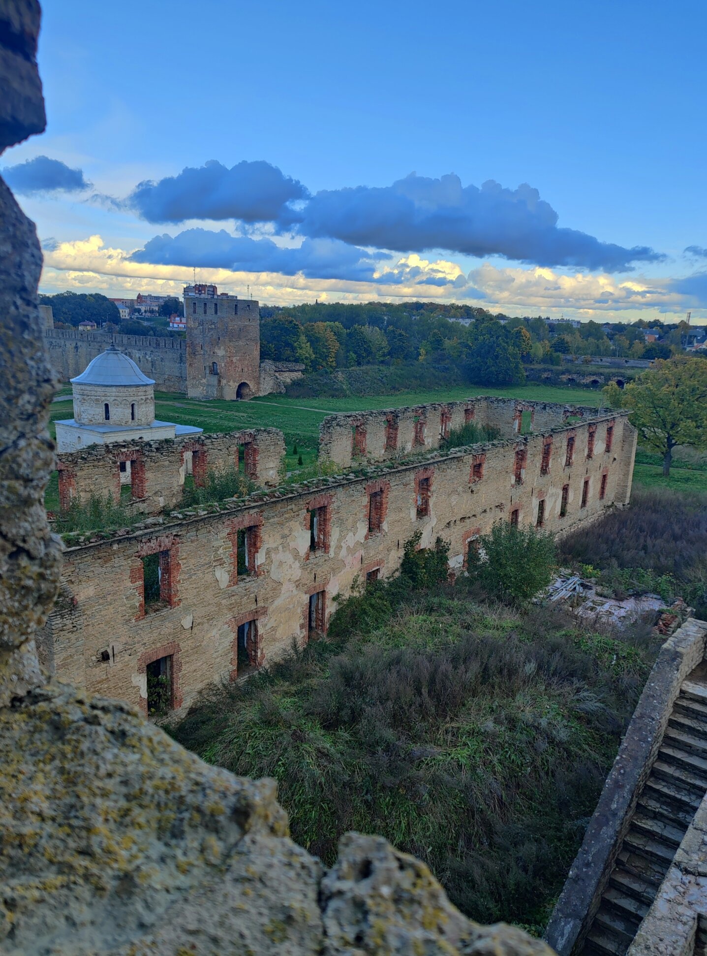 На представленной фотографии запечатлён вид с крепостной стены древней Ивангородской крепости, основанной во имя святого пророка Иоанна Предтечи. В центре композиции — благоговейно сохраняемые временем руины Большого порохового амбара, некогда служившего для хранения запасов крепости. Мощные каменные стены, ныне поросшие мхом, свидетельствуют о многовековой истории сего места.