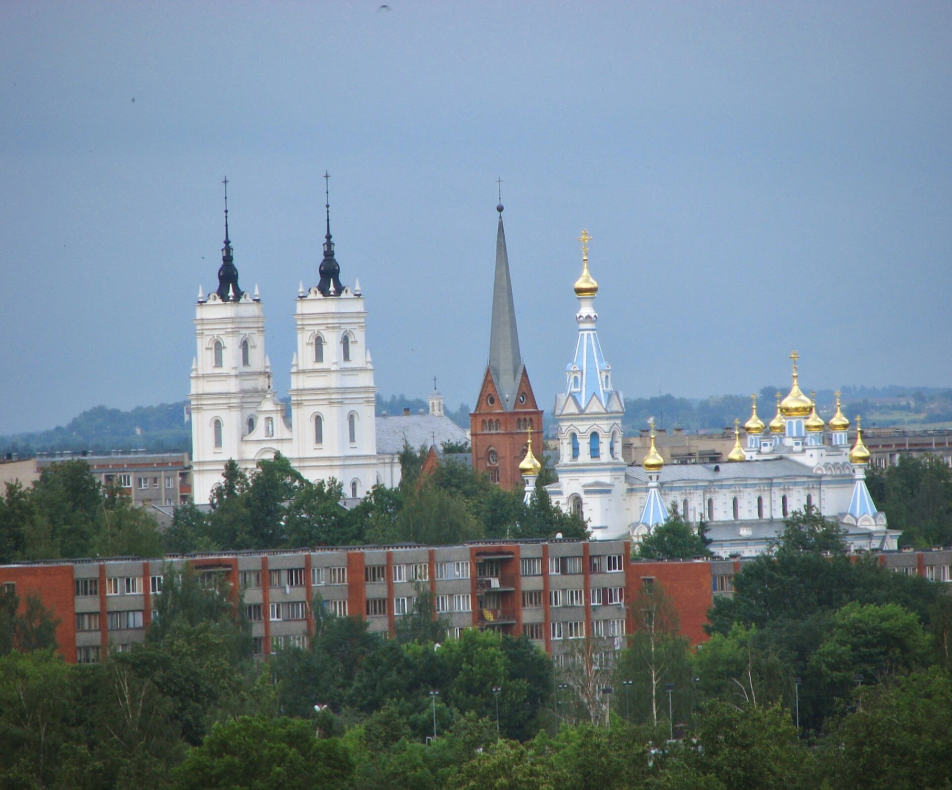 На представленной фотографии запечатлён величественный Борисоглебский кафедральный собор, расположенный на уникальном Церковном холме (Базниеку калнс) в городе Даугавпилс. Этот православный храм, освящённый в честь святых страстотерпцев Бориса и Глеба, является архитектурной доминантой исторического места, где мирно соседствуют четыре храма различных христианских конфессий.