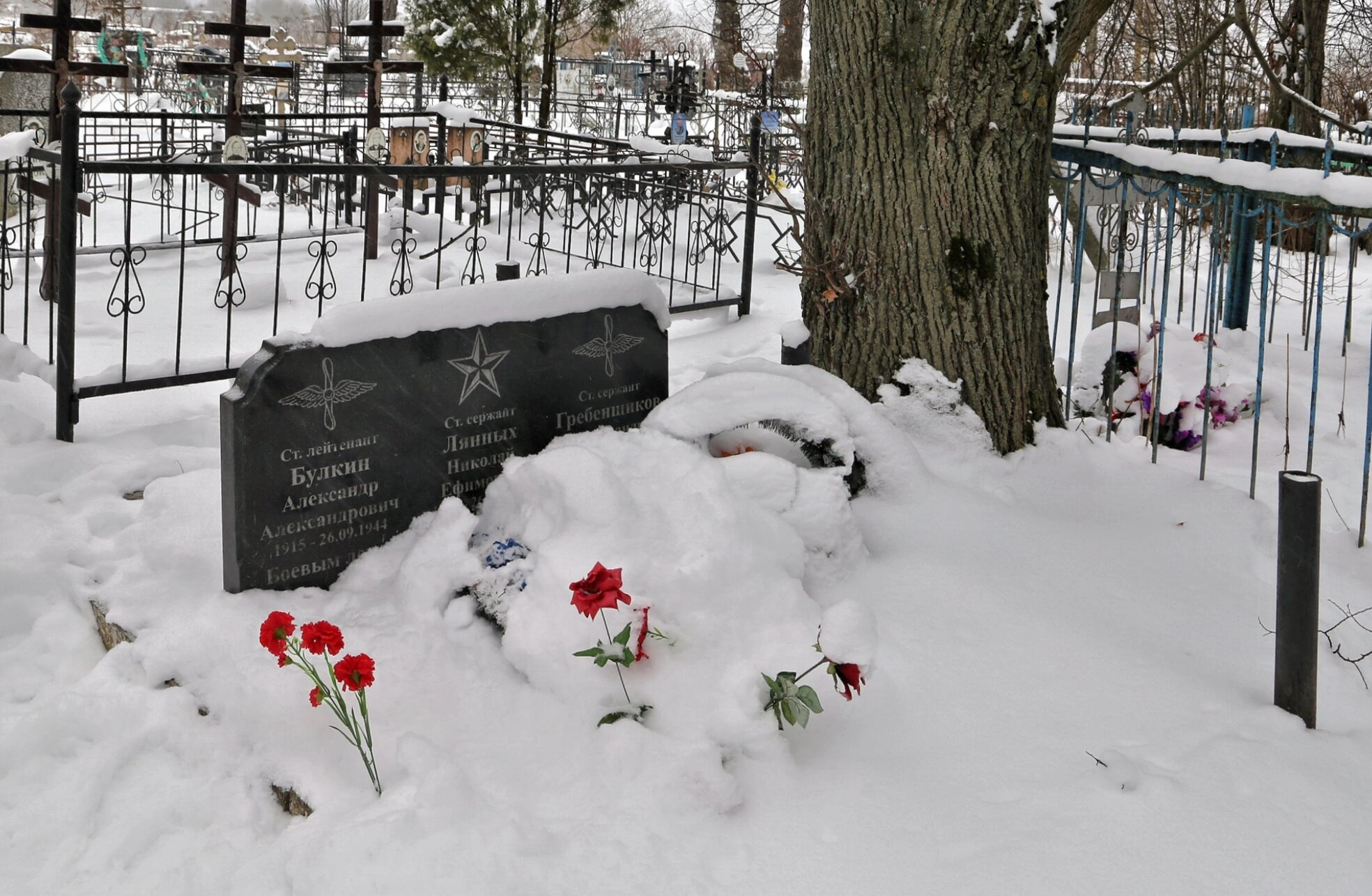На переднем плане отчетливо видно надгробие, возвышающееся над снежным покровом. На каменной плите высечены имена погребенных воинов: Булкин Александр Александрович и Лянных Николай Ефимович. Согласно историческим сведениям, это захоронение относится к периоду Великой Отечественной войны, когда в этих местах располагались авиационные части. Рядом с памятником, вопреки зимней стуже, размещены алые цветы как символ неугасающей памяти и молитвенного поминовения усопших.