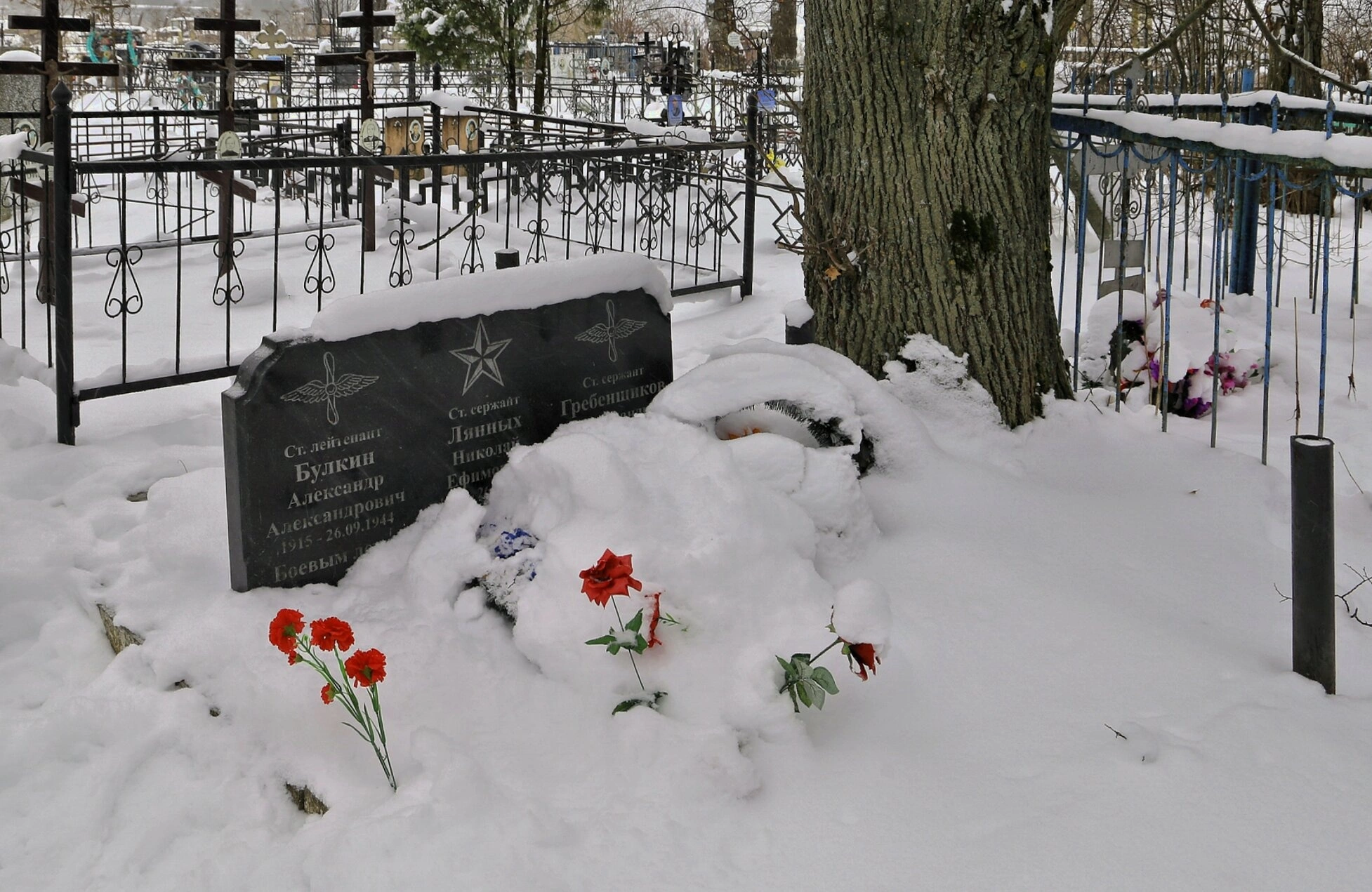 В центре композиции находится монументальное надгробие, на котором высечены имена погребенных воинов-авиаторов и даты их жизни. Перед памятником и вокруг него видны следы недавнего посещения - несколько алых цветов, ярко выделяющихся на белоснежном фоне. Эти цветы свидетельствуют о том, что память о павших герях жива и их могилу не оставляют без внимания.