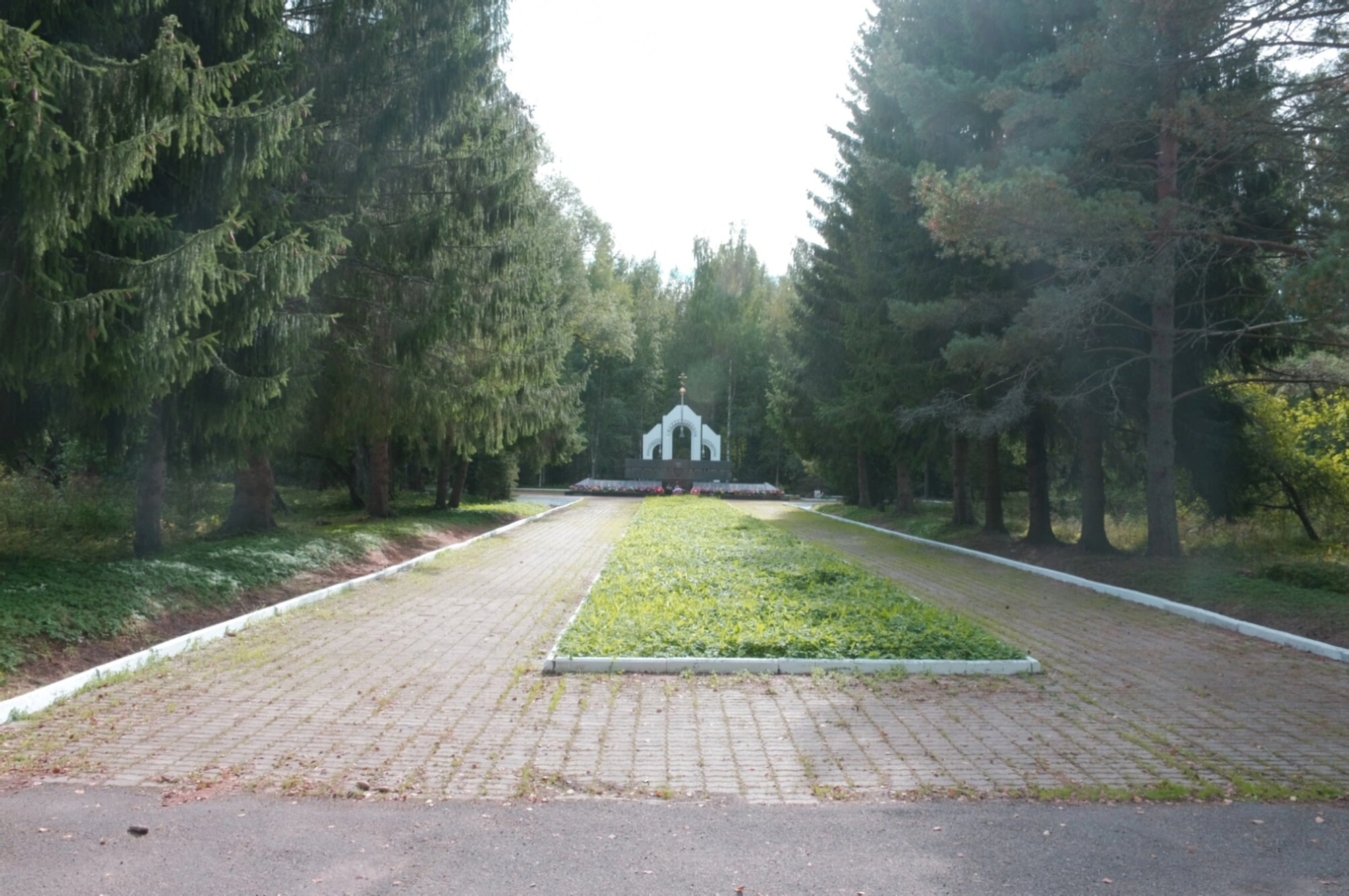 Аллея, вымощенная каменными плитами, ведет к монументу, выполненному в виде трех стилизованных арок белого цвета, символизирующих вечную память и духовное вознесение павших героев. Мемориал расположен на пригорке, окруженный хвойными деревьями - елями и соснами, что создает атмосферу благоговейной тишины и вечного покоя.