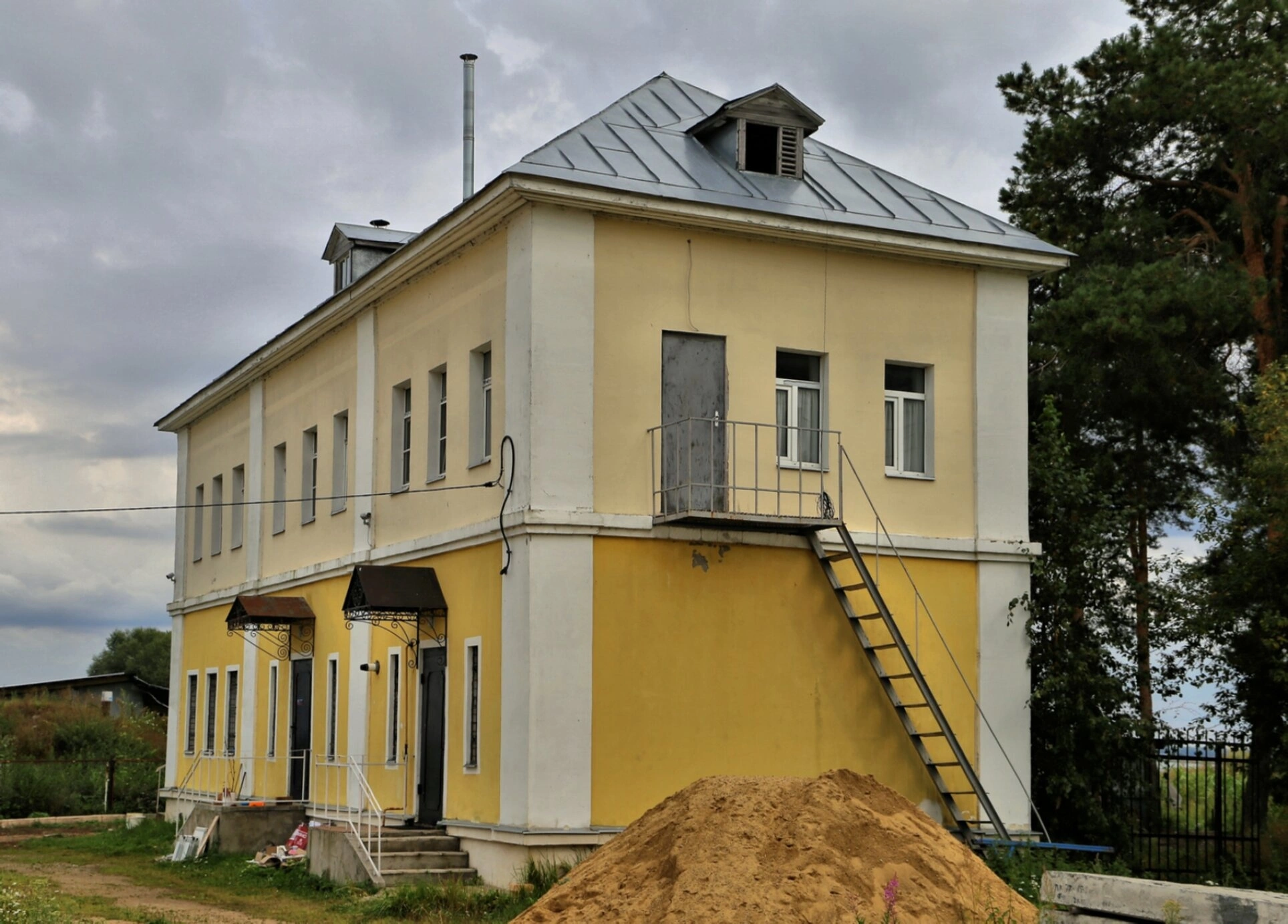 На переднем плане фотографии видна груда песка, свидетельствующая о ведущихся восстановительных или реставрационных работах, что вселяет надежду на возрождение былого благолепия святого места. На заднем плане открывается вид на кроны деревьев и пасмурное небо, создающее атмосферу тихого молитвенного уединения, свойственную северным русским монастырям.
