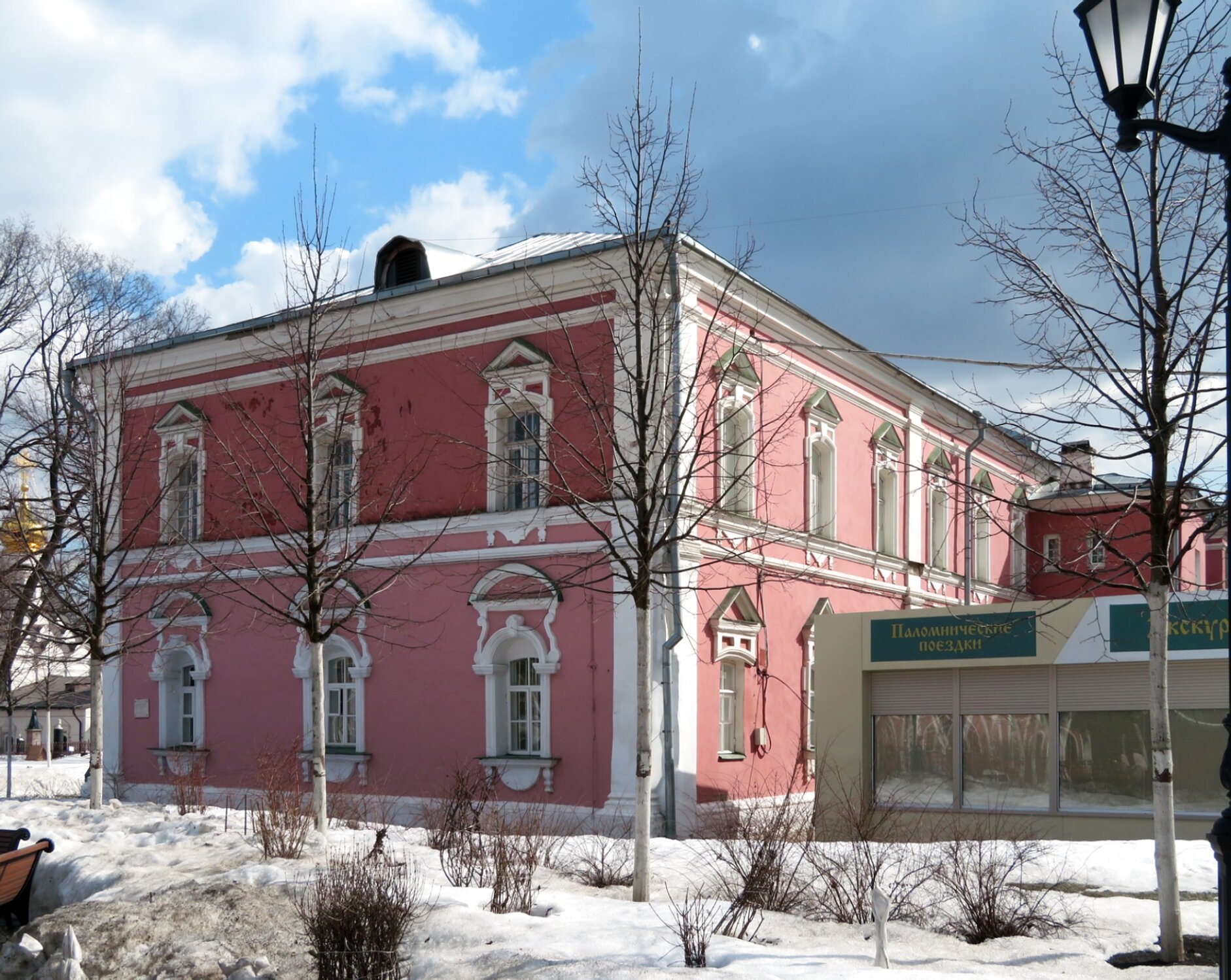 Важной деталью, указывающей на современное предназначение корпуса, является вывеска «Паломнические поездки», свидетельствующая о том, что в этом здании располагается паломническая служба монастыря. Именно отсюда верующие организуют путешествия по святым местам, получают благословение и необходимые указания для совершения благочестивого паломничества.