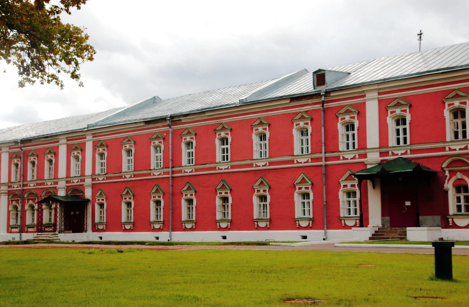 Стены корпуса выкрашены в тёплый красный цвет, что символически означает благолепие и торжественность православной веры. Белоснежные оконные рамы и наличники, украшенные скромным декоративным убранством, эффектно контрастируют с основным фоном, создавая ощущение чистоты и строгости, присущей монашеской жизни. Окна, расположенные в два яруса, пропускают обильный свет в келии и помещения, где трудятся и несут свое послушание насельники монастыря.