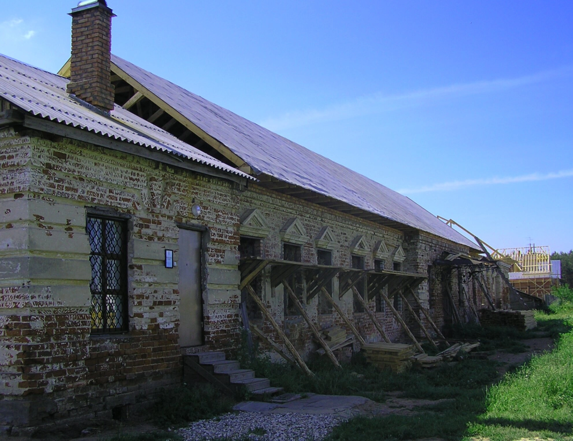 На представленной фотографии запечатлён братский корпус возрождаемого Свято-Николаевского Николо-Малицкого мужского монастыря, расположенного в Тверской области. Снимок сделан в 2007 году, в период активных восстановительных работ, что подчёркивается наличием деревянных подпорок, поддерживающих конструкцию здания.