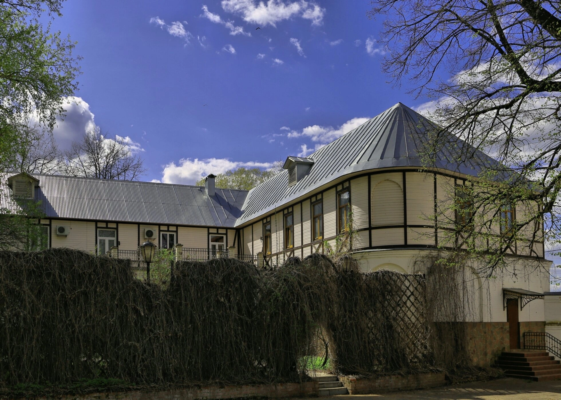 Перед корпусом видна густая зелёная растительность, образующая естественную ограду и гармонично вписывающаяся в архитектурный ансамбль. Распускающаяся листва на деревьях указывает на весеннее время, когда природа пробуждается, символизируя обновление и духовное возрождение. Ясное небо с лёгкими облаками подчёркивает светлый и возвышенный образ этого святого места.