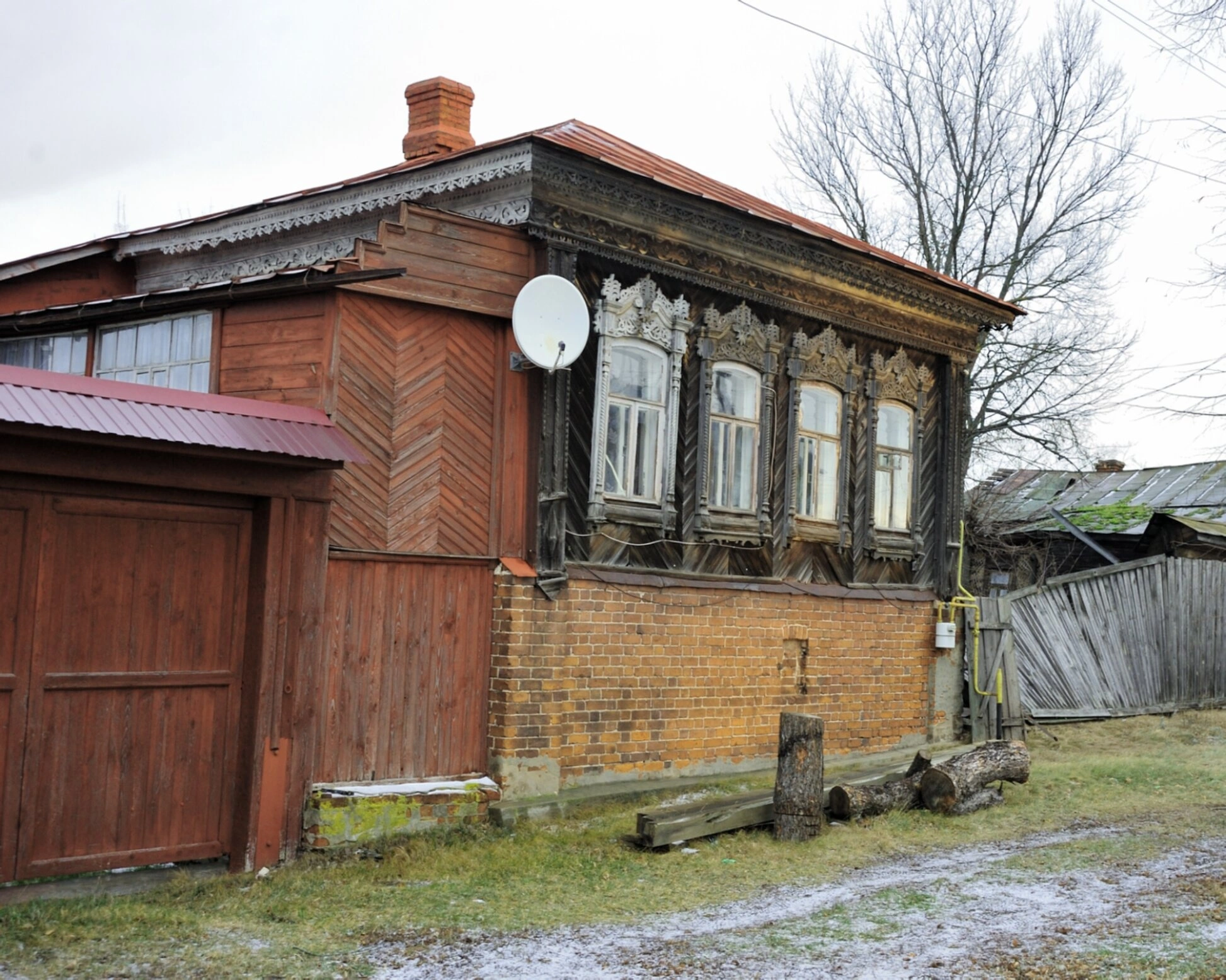 На фасаде здания заметна спутниковая тарелка, что свидетельствует о современном использовании помещения. Рядом с основным строением расположен деревянный забор и пристройка с красными воротами, формирующие единый архитектурный ансамбль. На заднем плане просматриваются другие постройки и деревья без листвы, что позволяет предположить, что фотография сделана в осенне-зимний период.