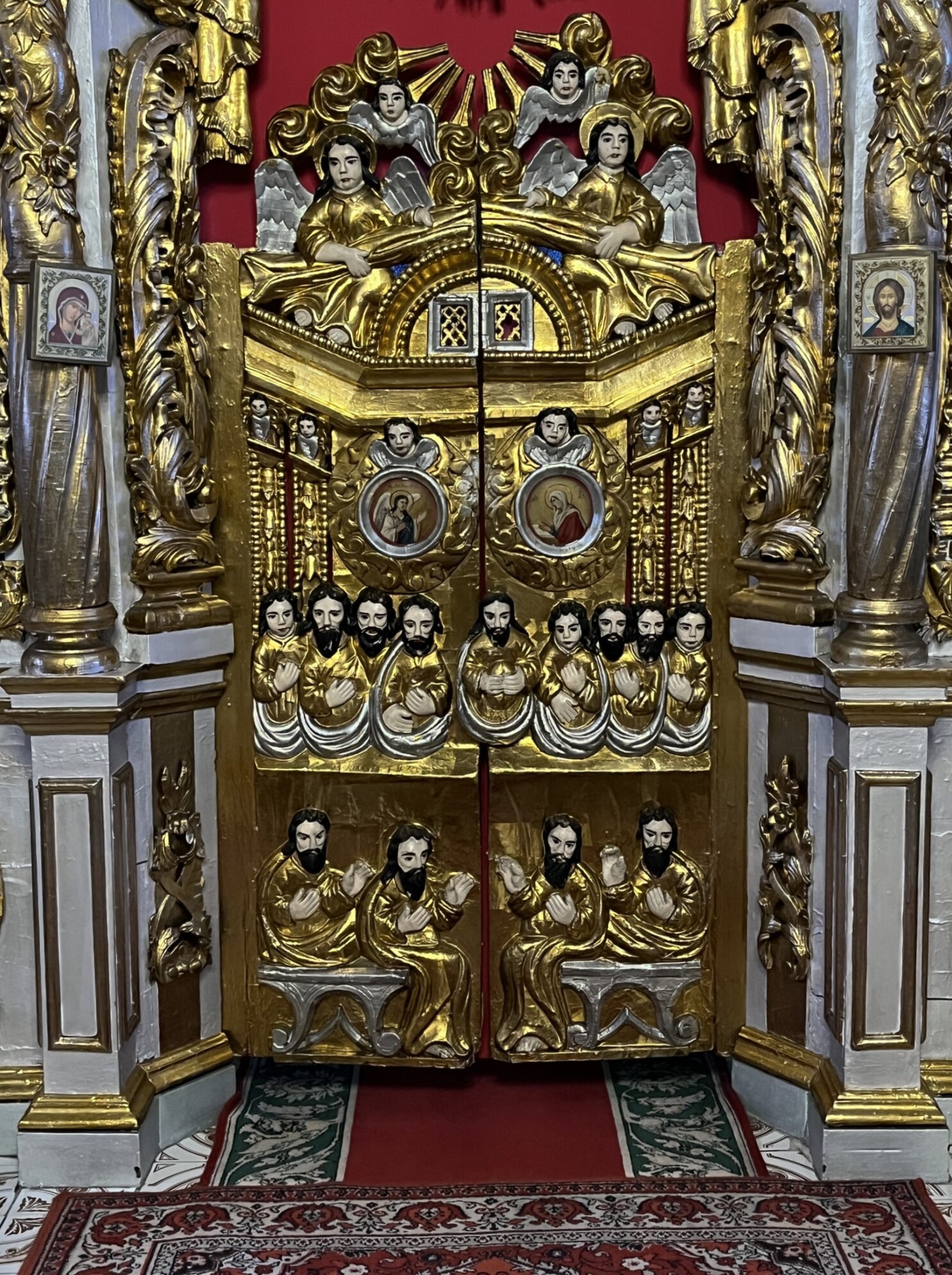 Центральную композицию образуют двустворчатые врата, богато украшенные позолоченной резьбой. На каждой створке размещены круглые иконные образы в обрамлении сложного орнамента. По периметру врат расположены резные изображения святых и ангельских чинов с выразительными ликами и светлыми нимбами.