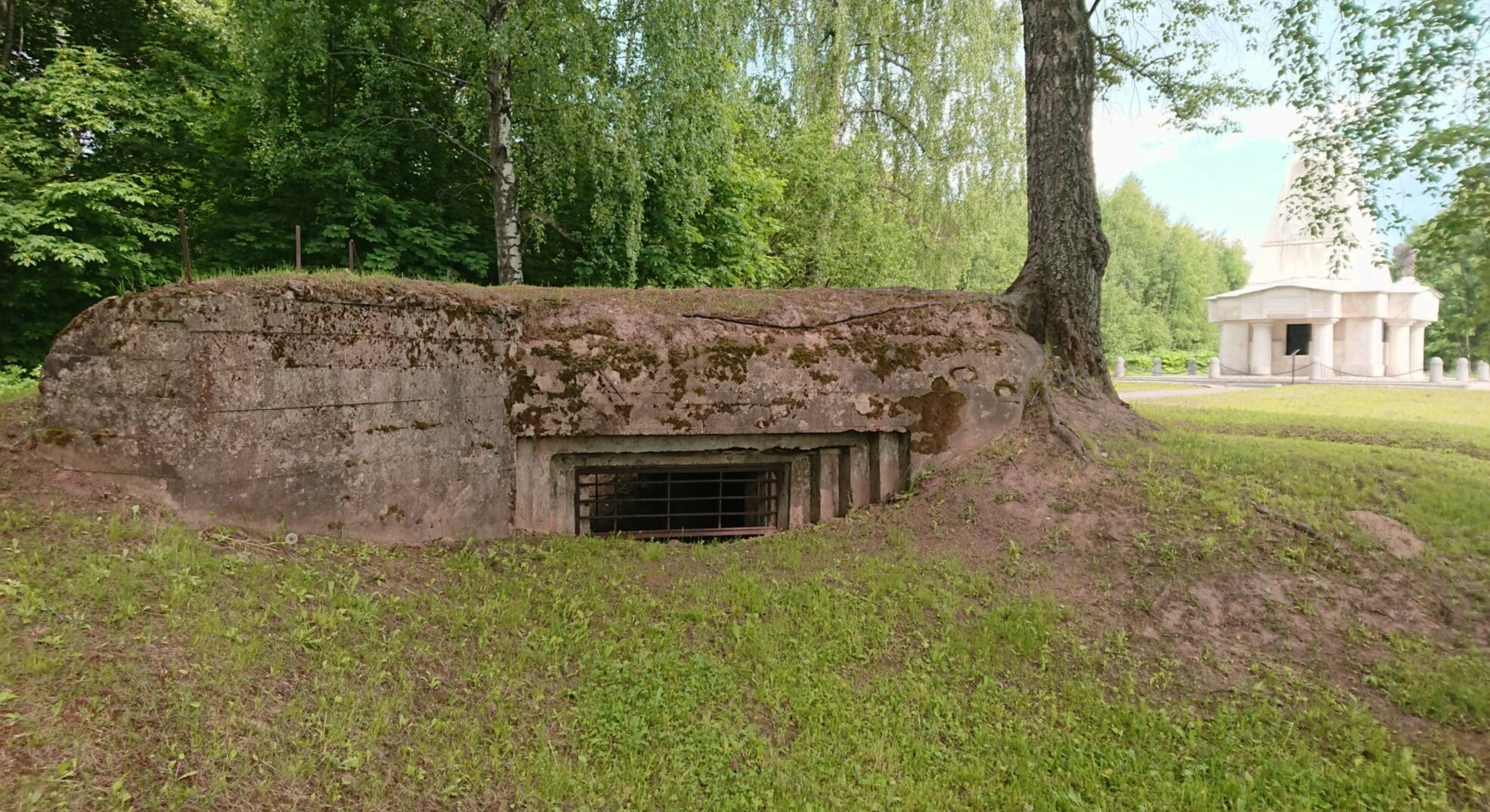 Возвышающийся на холме, покрытом изумрудной травой, бункер соседствует с могучим деревом, ветви которого были обрублены в ходе боевых действий. Эта деталь напоминает о ожесточенных сражениях, проходивших на подступах к Москве в 1941-1942 годах.