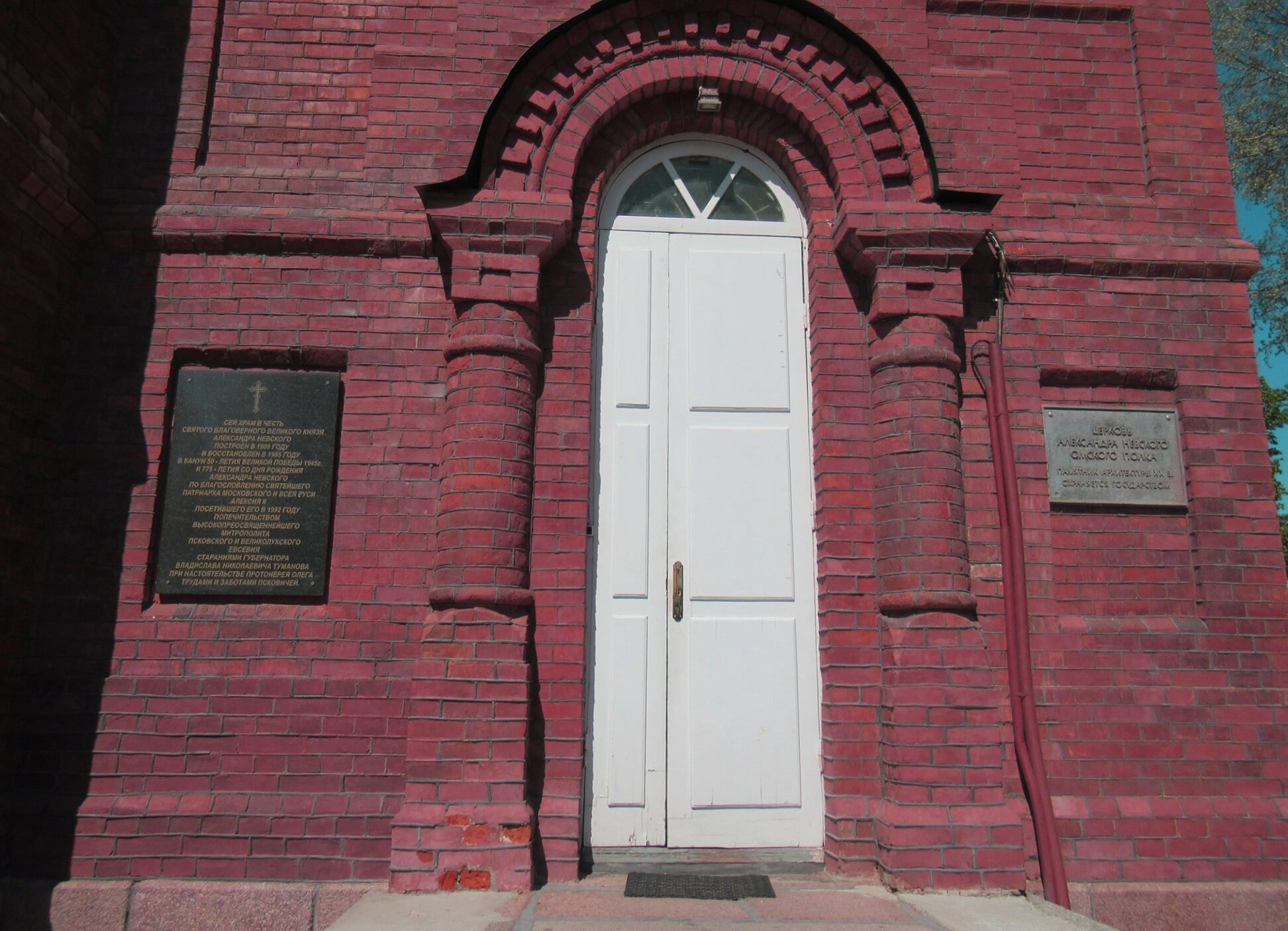 На фотографии запечатлён фасад Церкви во имя святого благоверного князя Александра Невского, расположенной в древнем Пскове. Здание храма, возведённое из красного кирпича, представляет собой образец церковной архитектуры, сохраняющей традиции православного зодчества. Центральным элементом композиции является арочный вход, увенчанный белой дверью, которая символизирует духовный путь и врата в священное пространство.