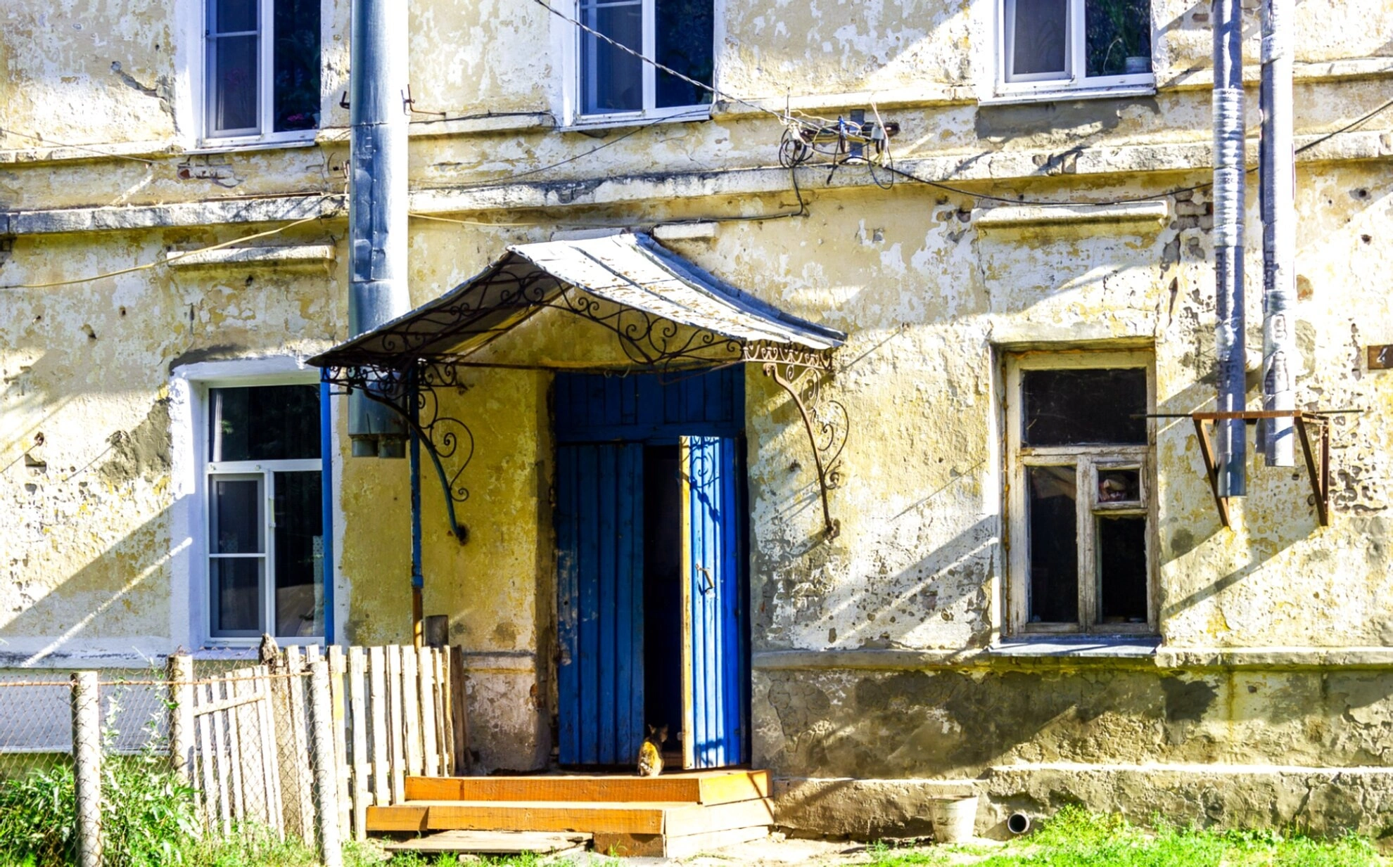 Фасад здания выполнен в традиционных для церковной архитектуры цветах: стены окрашены в жёлтый цвет, который со временем частично облупился, что придаёт сооружению особый шарм старины. Центральным элементом композиции является входная группа с выразительной ярко-синей дверью, слегка приоткрытой для доступа верующих. Над входом расположен изящный металлический козырёк с художественными коваными элементами, характерными для церковного зодчества.