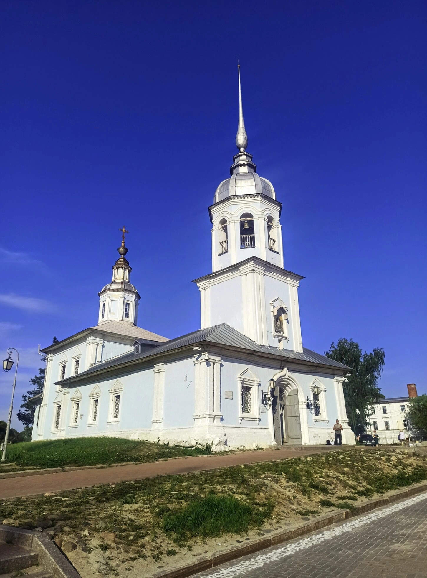 На переднем плане фотографии видна вымощенная брусчаткой дорожка, ведущая ко входу в храм. Слева от церкви установлен старинный фонарный столб. Справа от храма просматриваются другие городские постройки, включая белое двухэтажное здание, а также деревья и кустарники. Рядом с открытой дверью в церковь стоит человек, что добавляет кадру живости, но лицо его не показано крупным планом. На участке справа заметны признаки текущих благоустроительных работ.